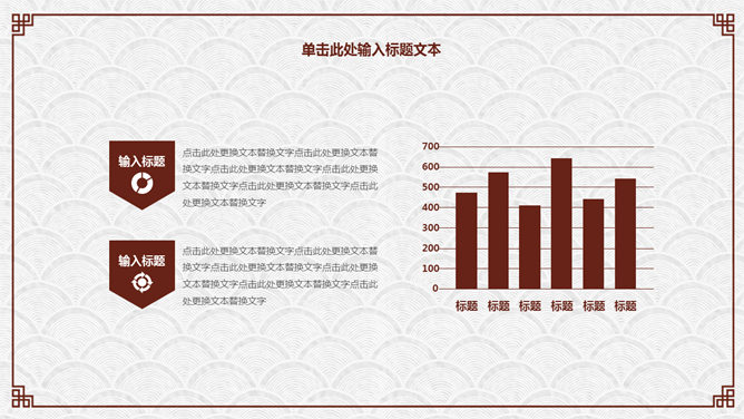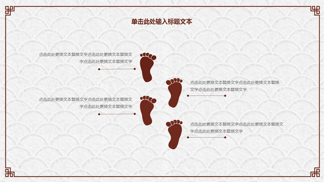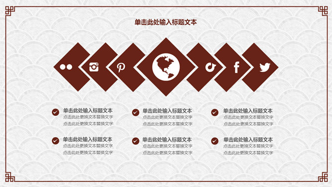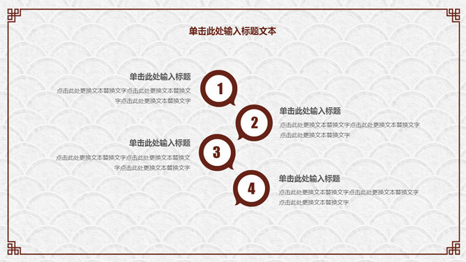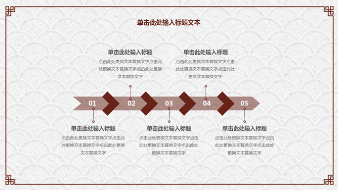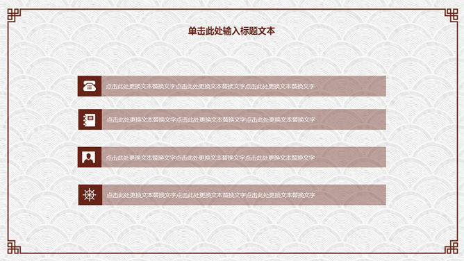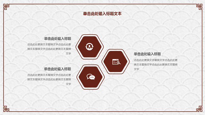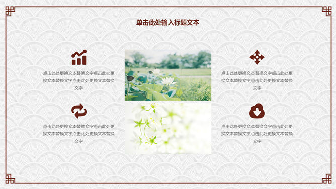精约古典高雅文艺PPT模板。一套精约古典中国风幻灯片模板,云纹纹理背景,赤色梅花装修,回形纹边框。