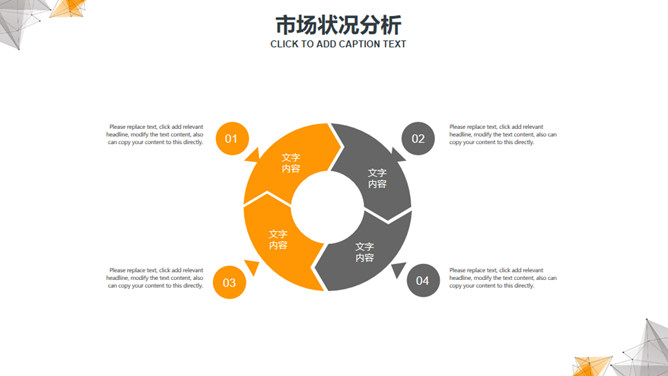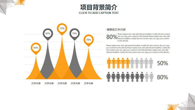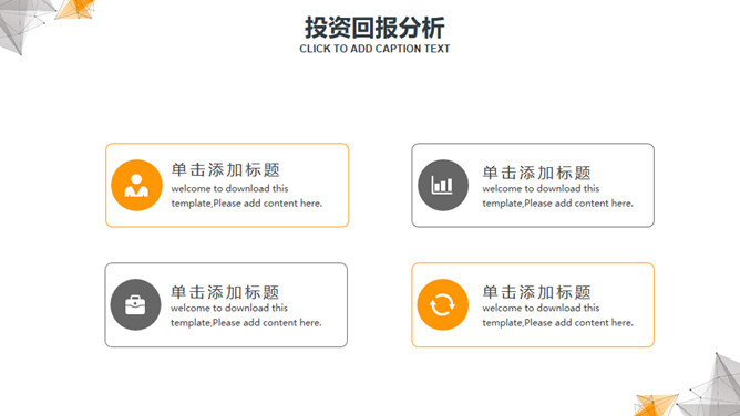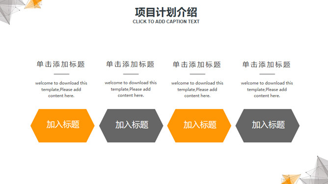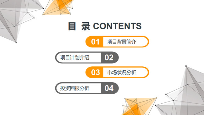 点线科技商业方案书PPT模板。一天精约通用幻灯片模板,黄灰配色,点线科技风规划,合适商业创业方案等用处。