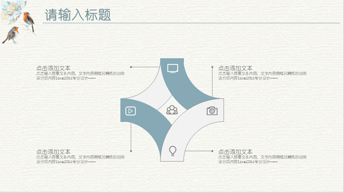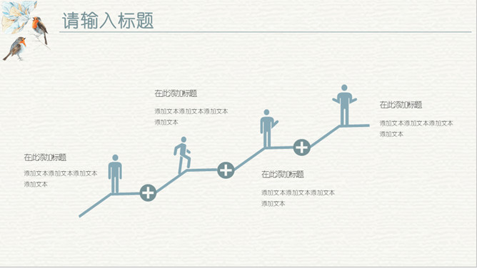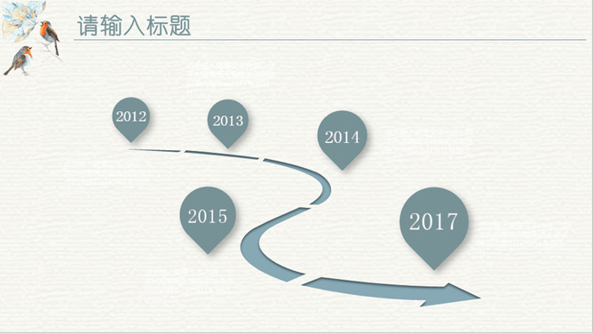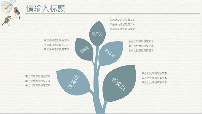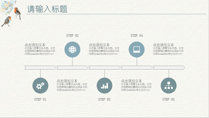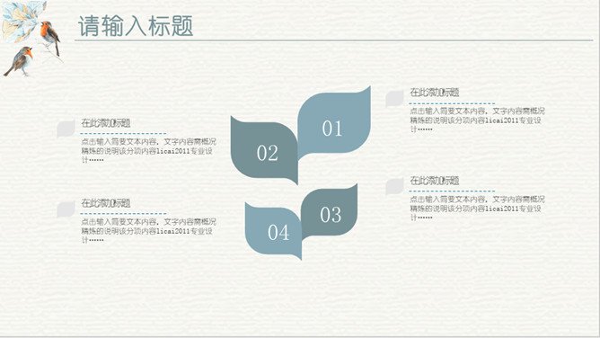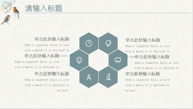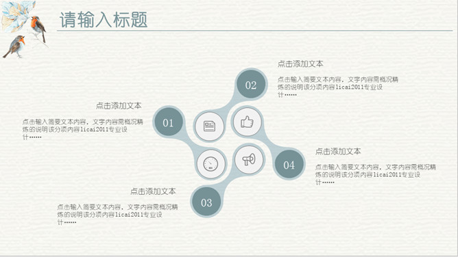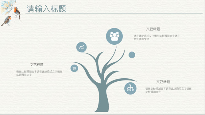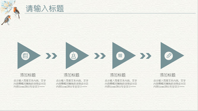 淡雅复古水彩花鸟PPT模板。一套欧式复古风幻灯片模板,淡雅莫兰迪色配色,水彩效果花朵小鸟主元素设计。