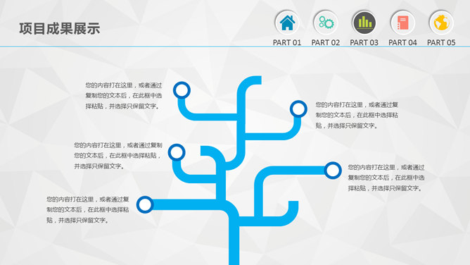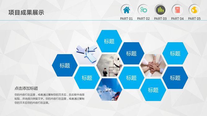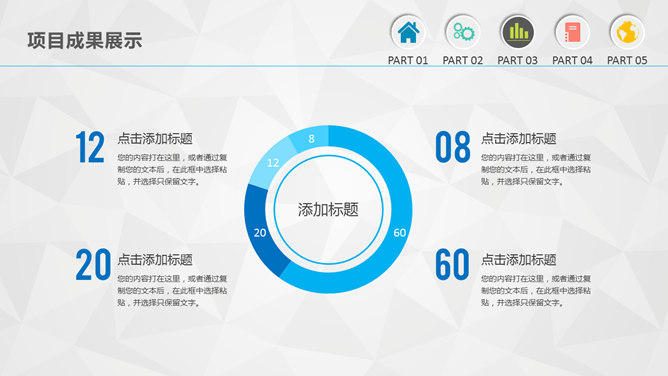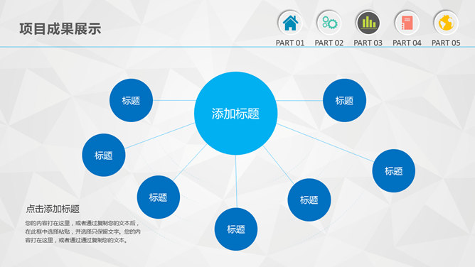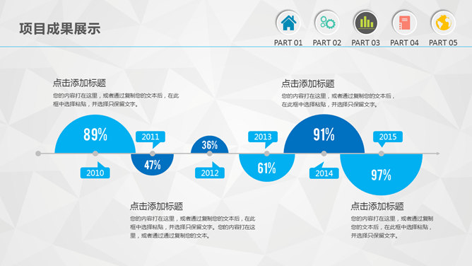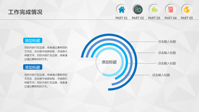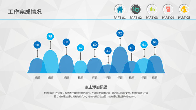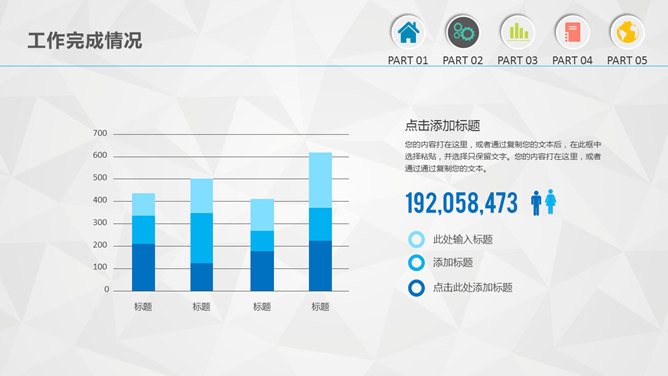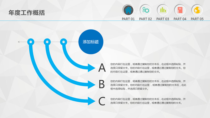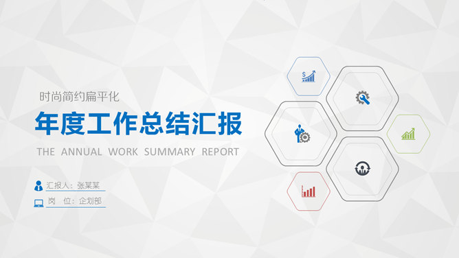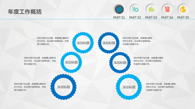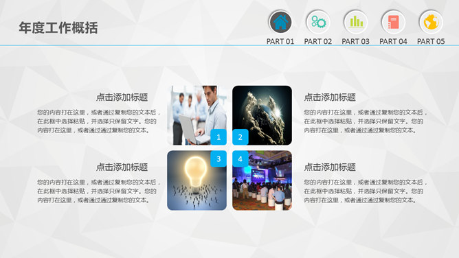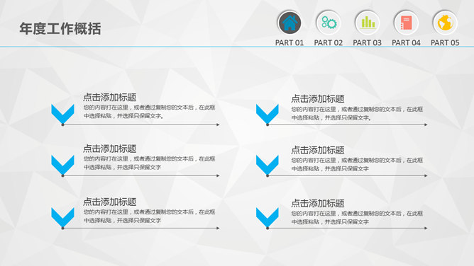 大气实用年度总结汇报PPT模板。一套年终工作总结汇报陈述幻灯片模板,蓝灰配色,页面丰厚,大气实用。