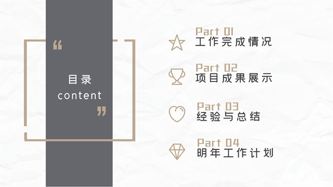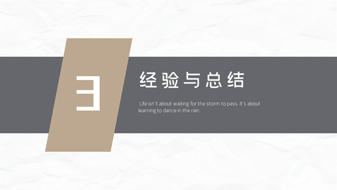 简练大方年终工作报告PPT模板。一套工作总结幻灯片模板,简练规划,大气稳重配色,动态播放,适合年终工作汇报。