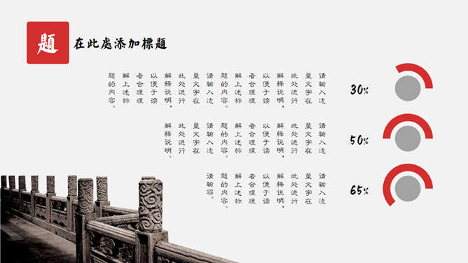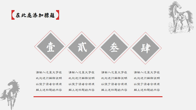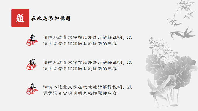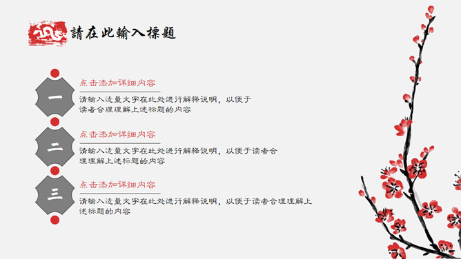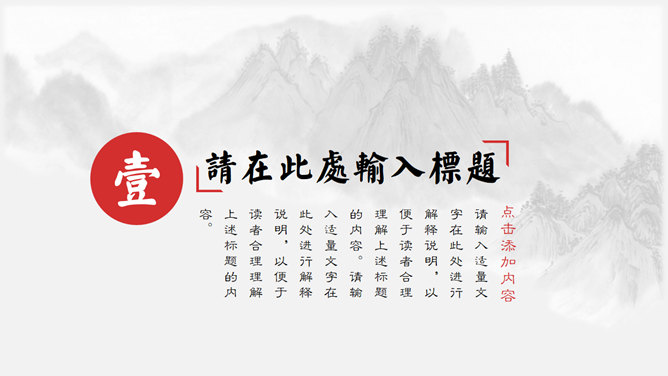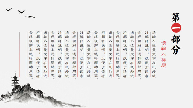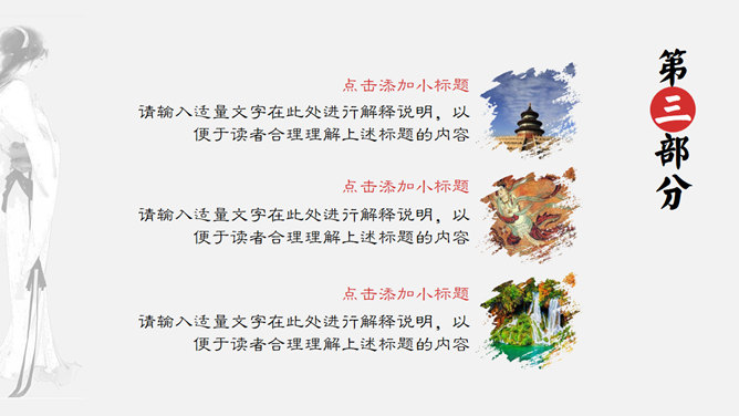 高雅大方有用中国风PPT模板。一套中国风汇报通用幻灯片模板,大气有用,附带背景音乐,运用毛笔字体较多,留意安装:白舟隼风、方正魏碑简体、方正启体繁体、汉仪颜楷繁、方正隶变简体、方正行楷繁体。