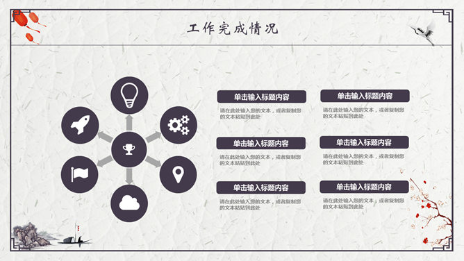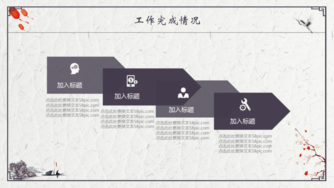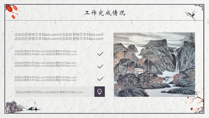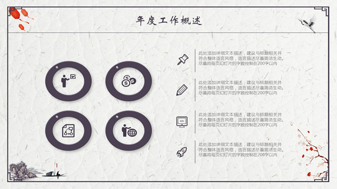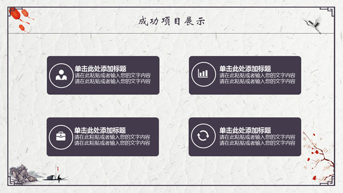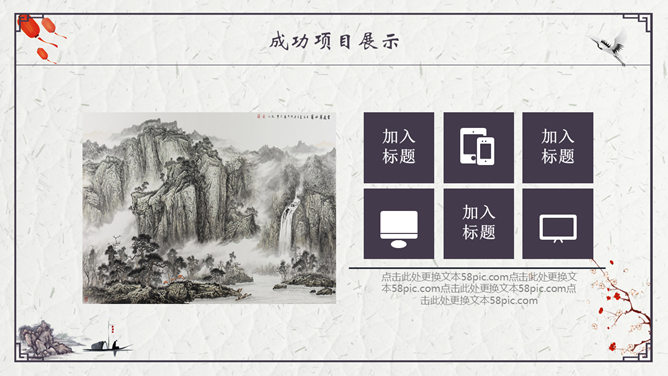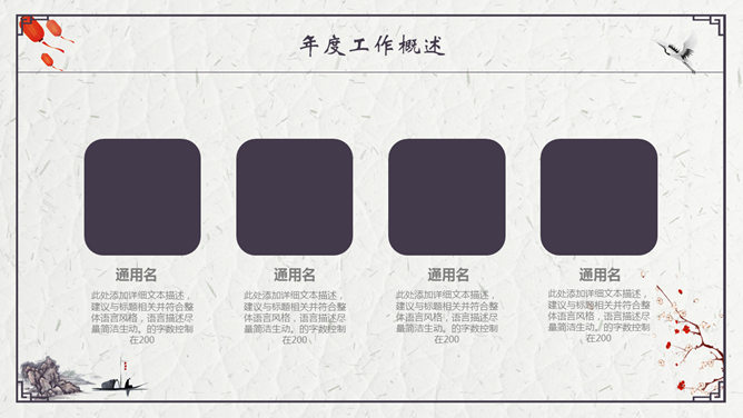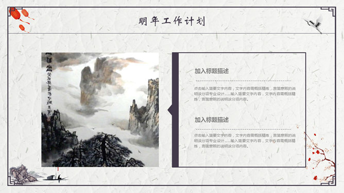 精美简约古典中国风PPT模板。一套规划精美的中国风幻灯片模板,古典灯笼、梅花、山水资料装修,动态播映。