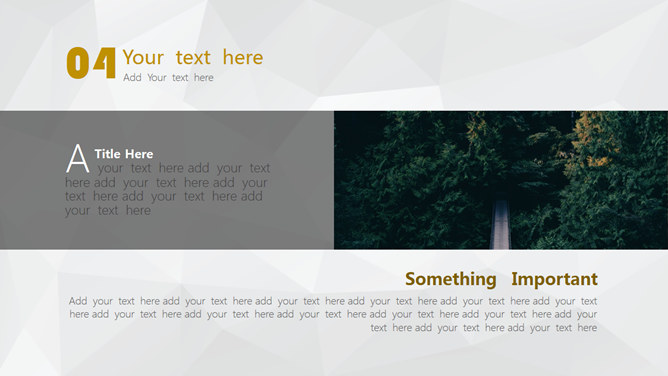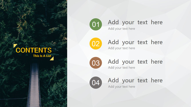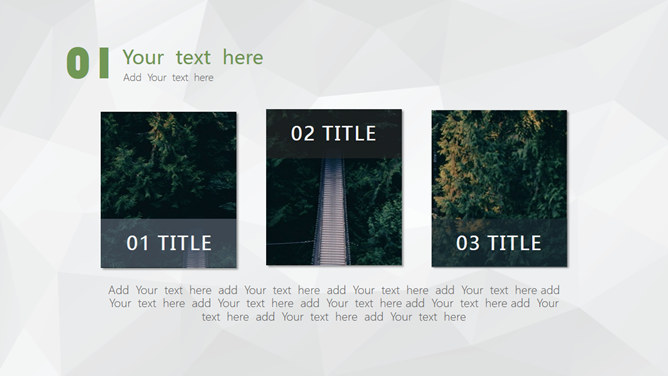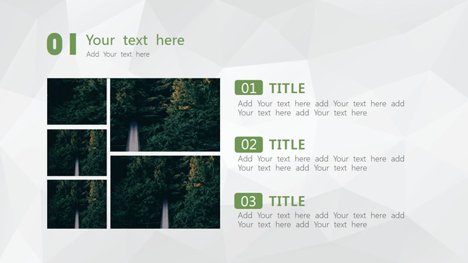 一份商务总结报告通用PPT模板,浅灰色低多边形布景,风格时尚简约,宽屏版式,绿色森林主题图片,假如不喜欢可替换图片素材,共27页,页面类型丰厚,适用性强,可用于商务报告,年终工作总结等用途。
