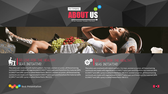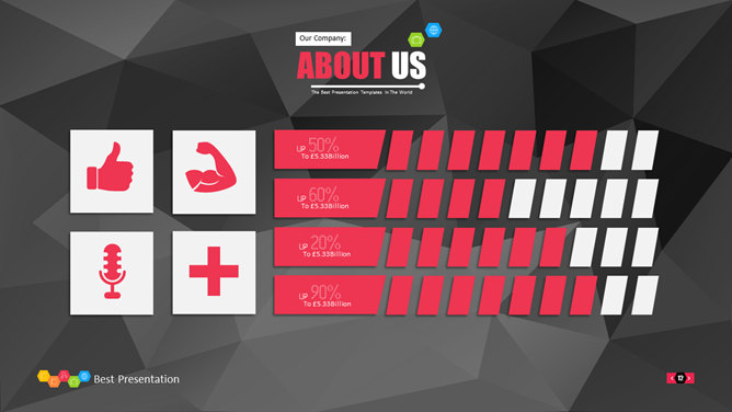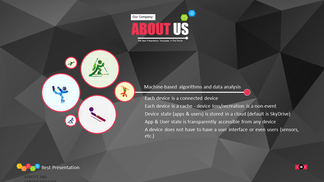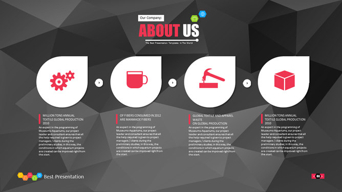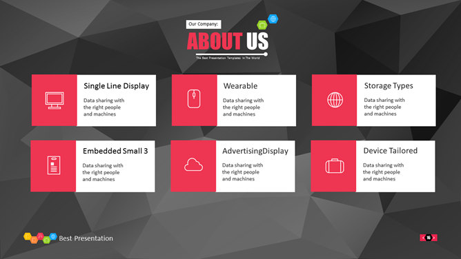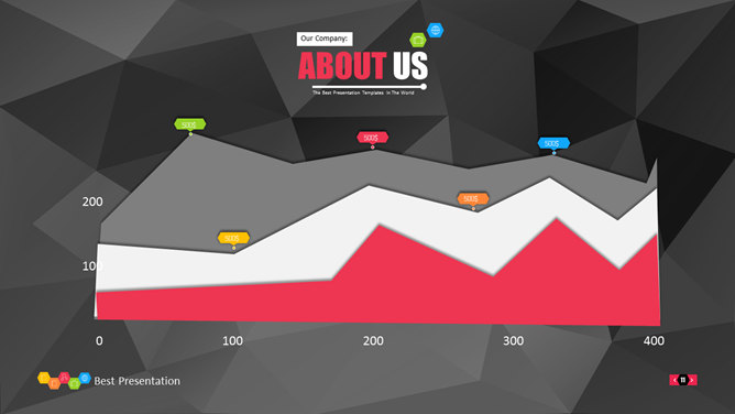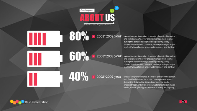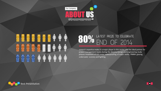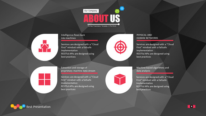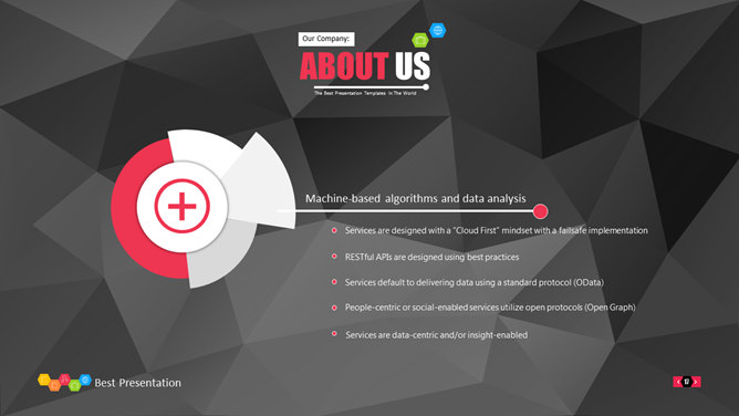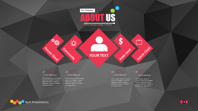创意黑色低面布景PPT模板。一份创意设计PowerPoint模板,黑色质感低面多边形布景,配色新鲜,通用性强。