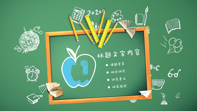 黑板手绘文具说课公开课PPT模板。一套教学说课幻灯片模板,黑板手绘粉笔作用设计,铅笔尺子等文具元素装修。