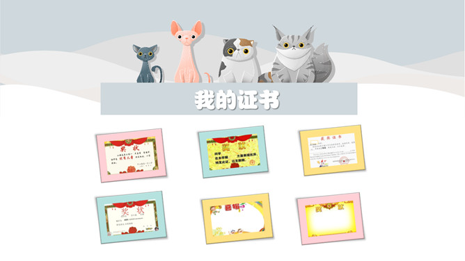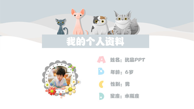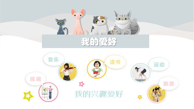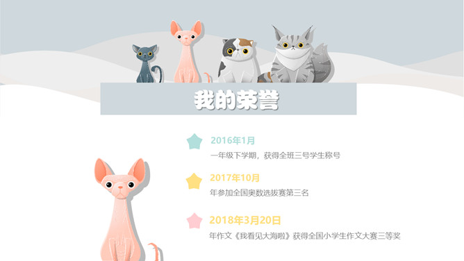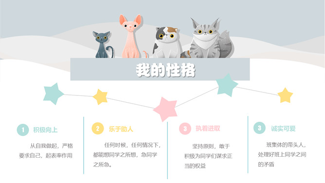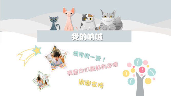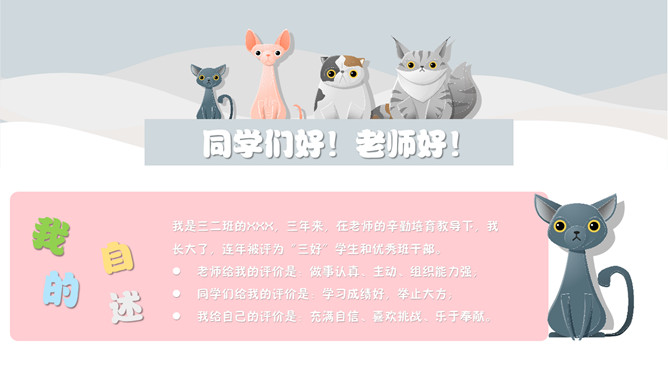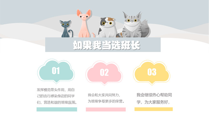 小学生卡通猫咪毛遂自荐PPT模板。一套小学生班干部竞选毛遂自荐幻灯片模板,可爱卡通猫咪元素规划,动态播放。