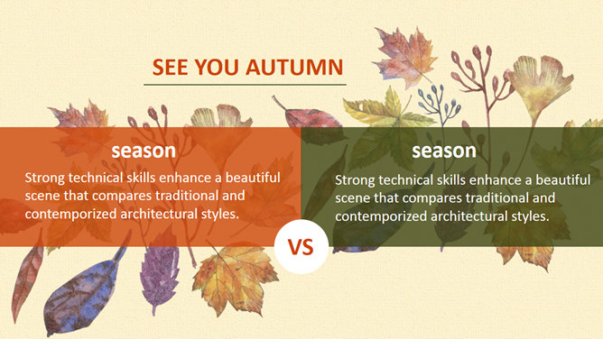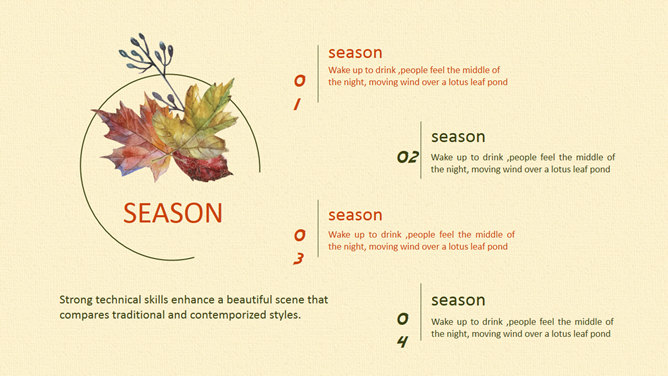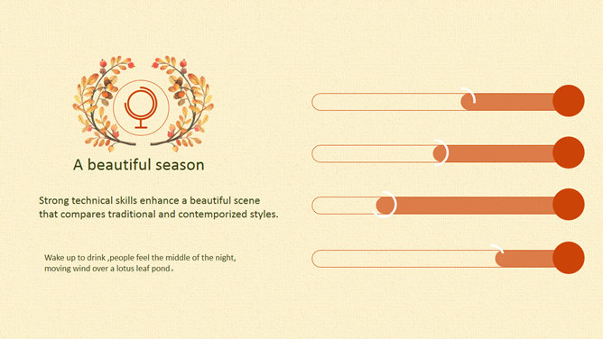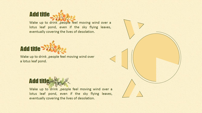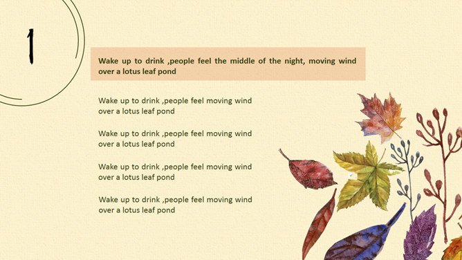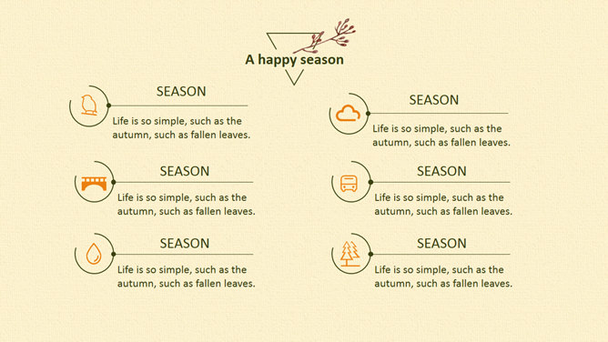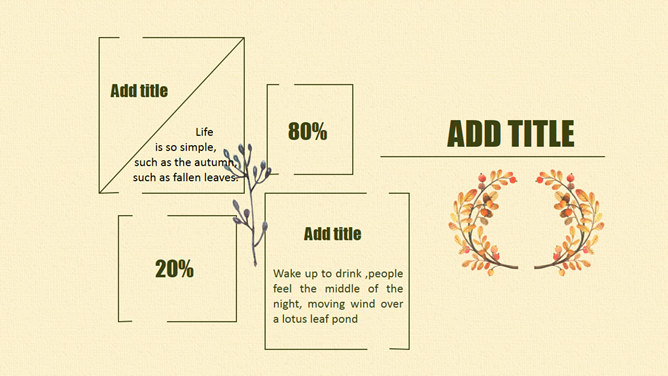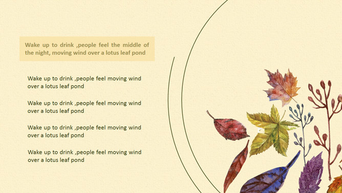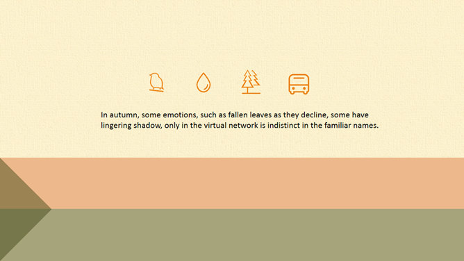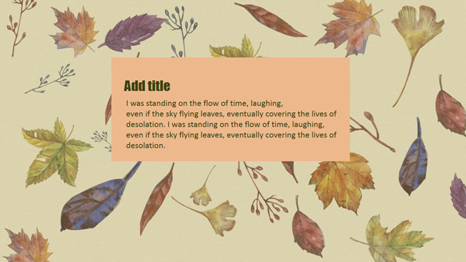 布纹布景秋天落叶树叶PPT模板。一套秋季秋天主题幻灯片模板,米黄色布纹布景,唯美秋叶落叶装饰。