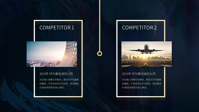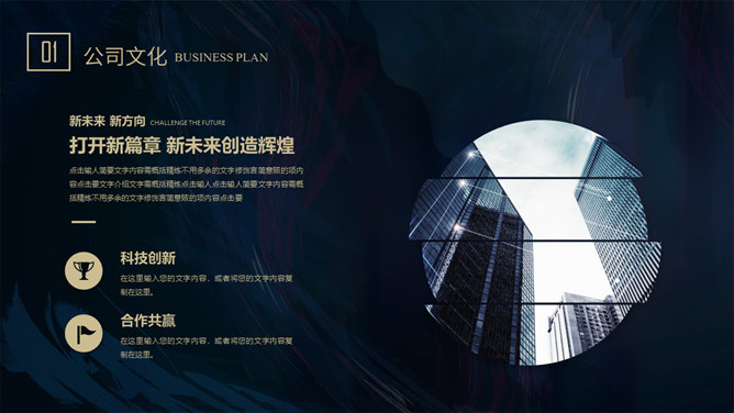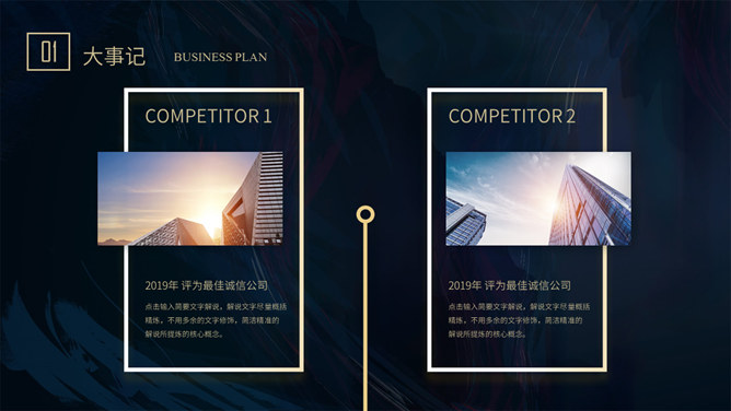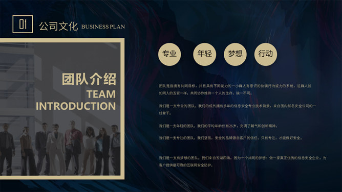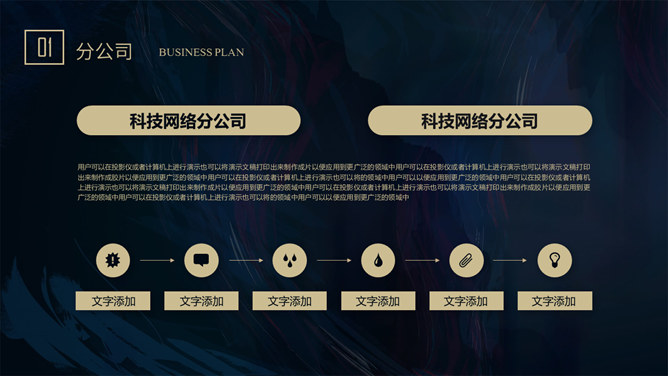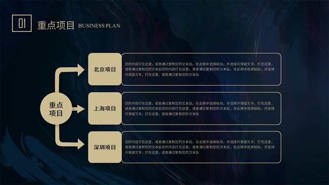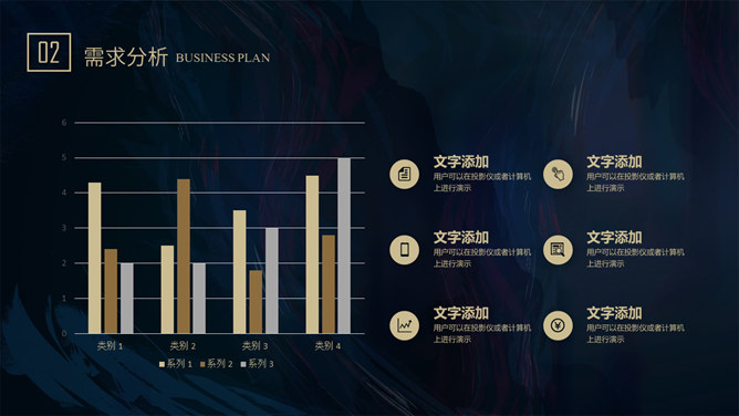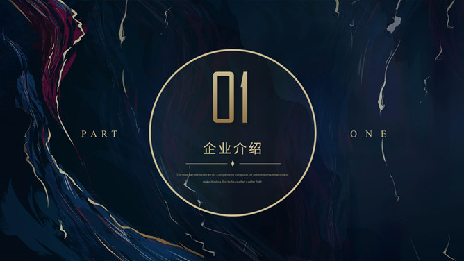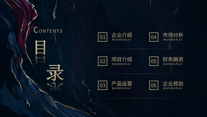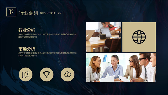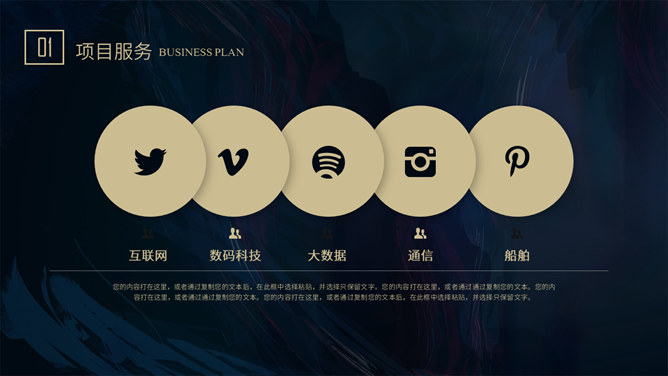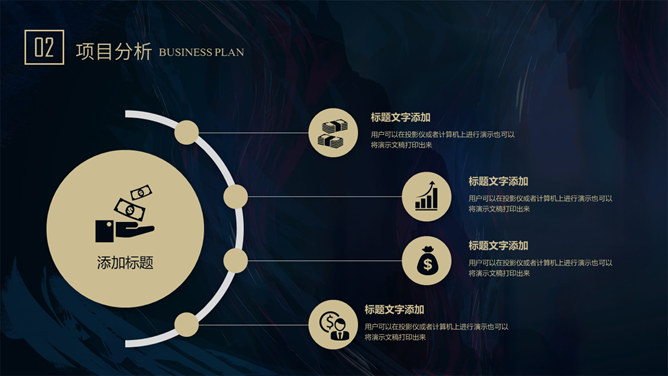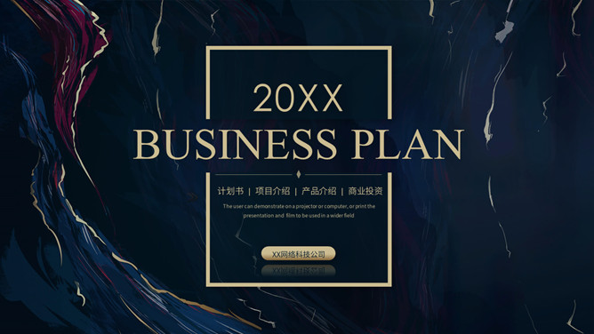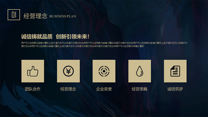 质感高端商业计划书PPT模板。一套大气商务风格幻灯片模板,深蓝艺术纹理背景,暗金主色调,合适商务场合。