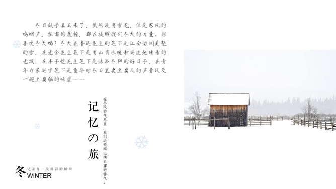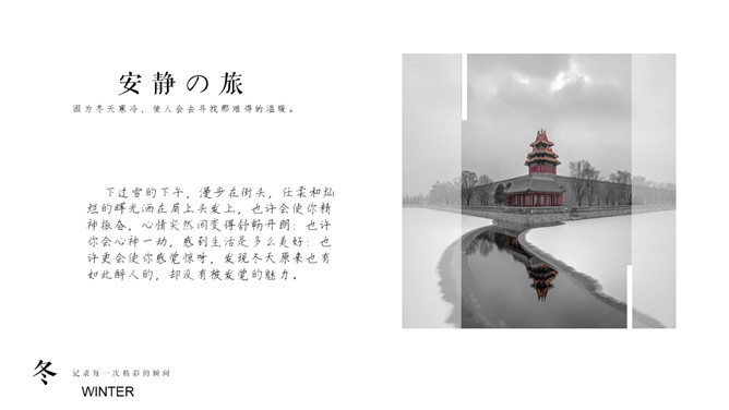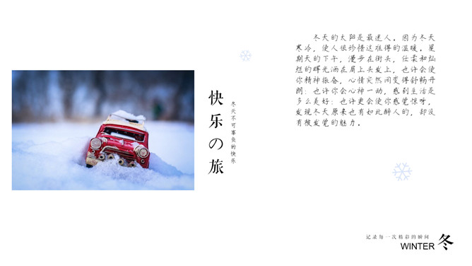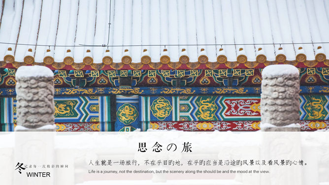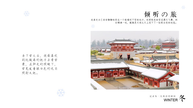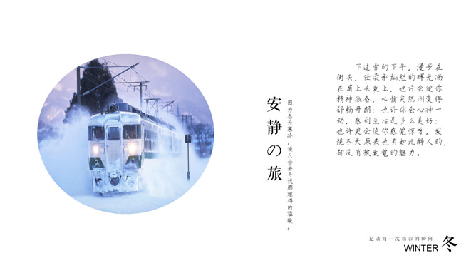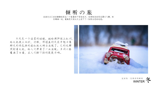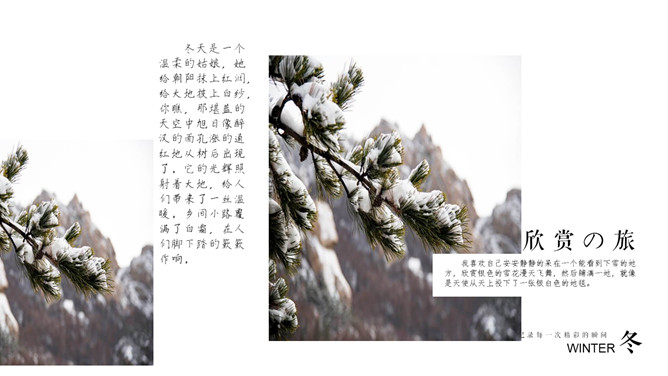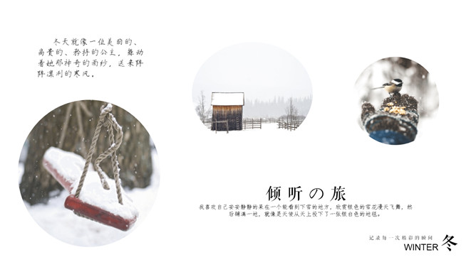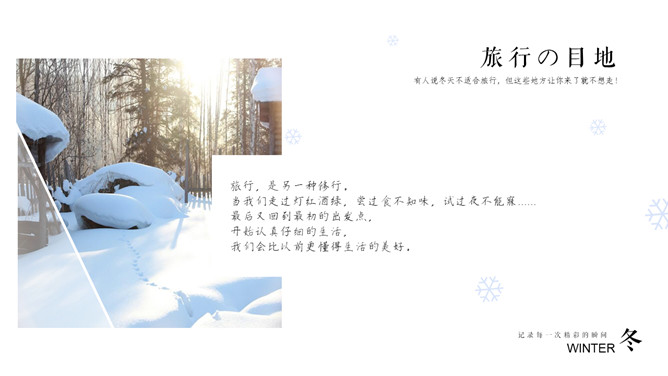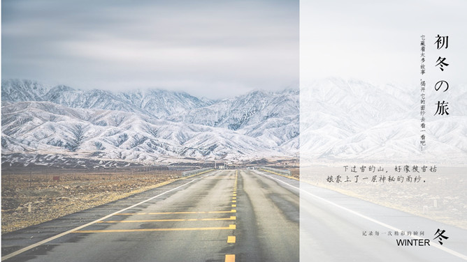 冬季游览游览日记相册PPT模板。一套冬季游览游览相册日记幻灯片模板,精约规划,多种图文排版页面,很有文艺范。