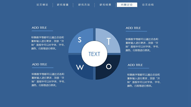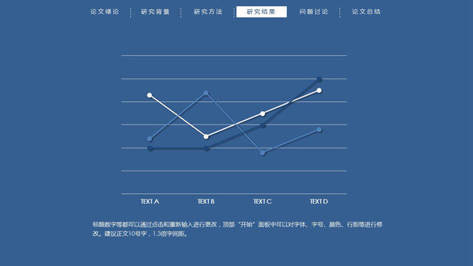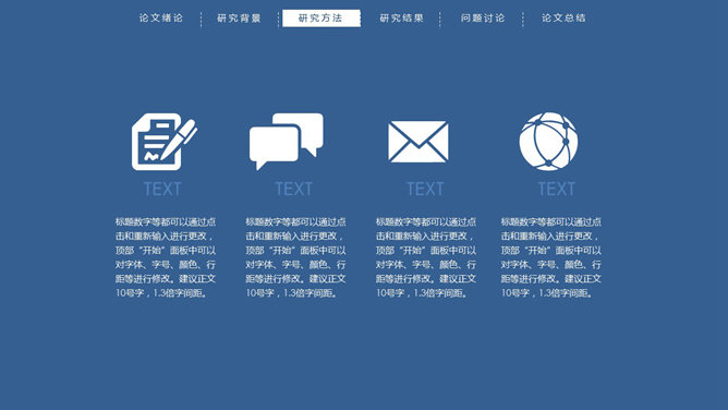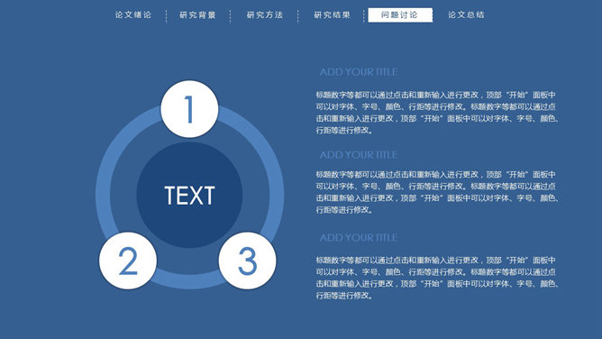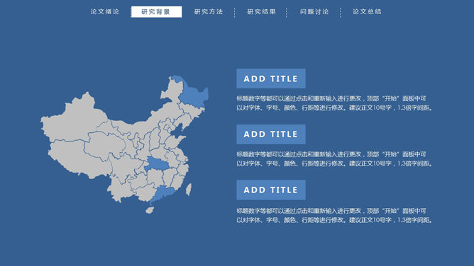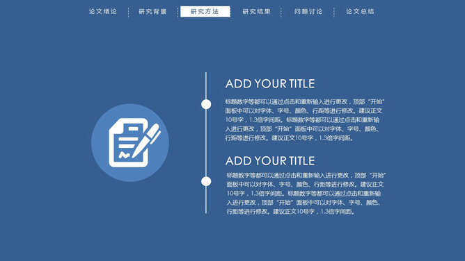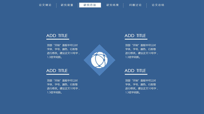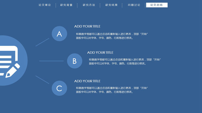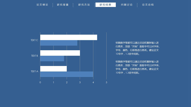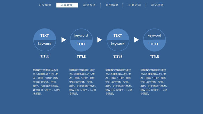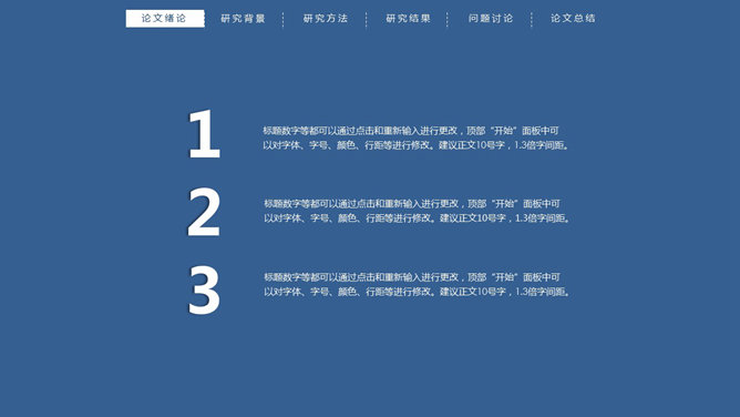 顶部导航简约论文答辩PPT模板。一份简练大方的毕业设计论文答辩PowerPoint模板,严谨慎重蓝色主色调,页面顶部项目导航。
