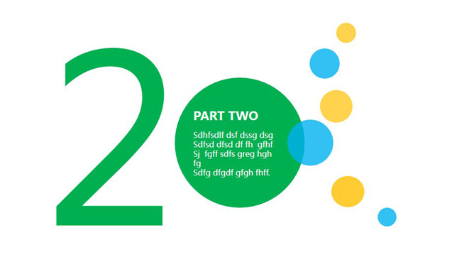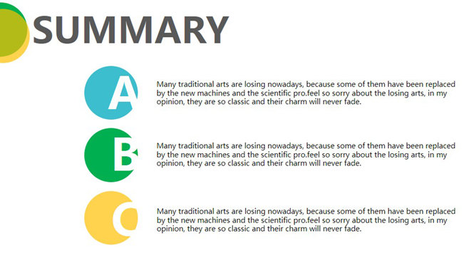 一份多用途多功用能好看的PPT模板,黄色、绿色、蓝色三色清新生机色调配色,纯白色布景,给人清新简约时髦之感,页面类型及功用丰富,用途广泛,小编引荐。