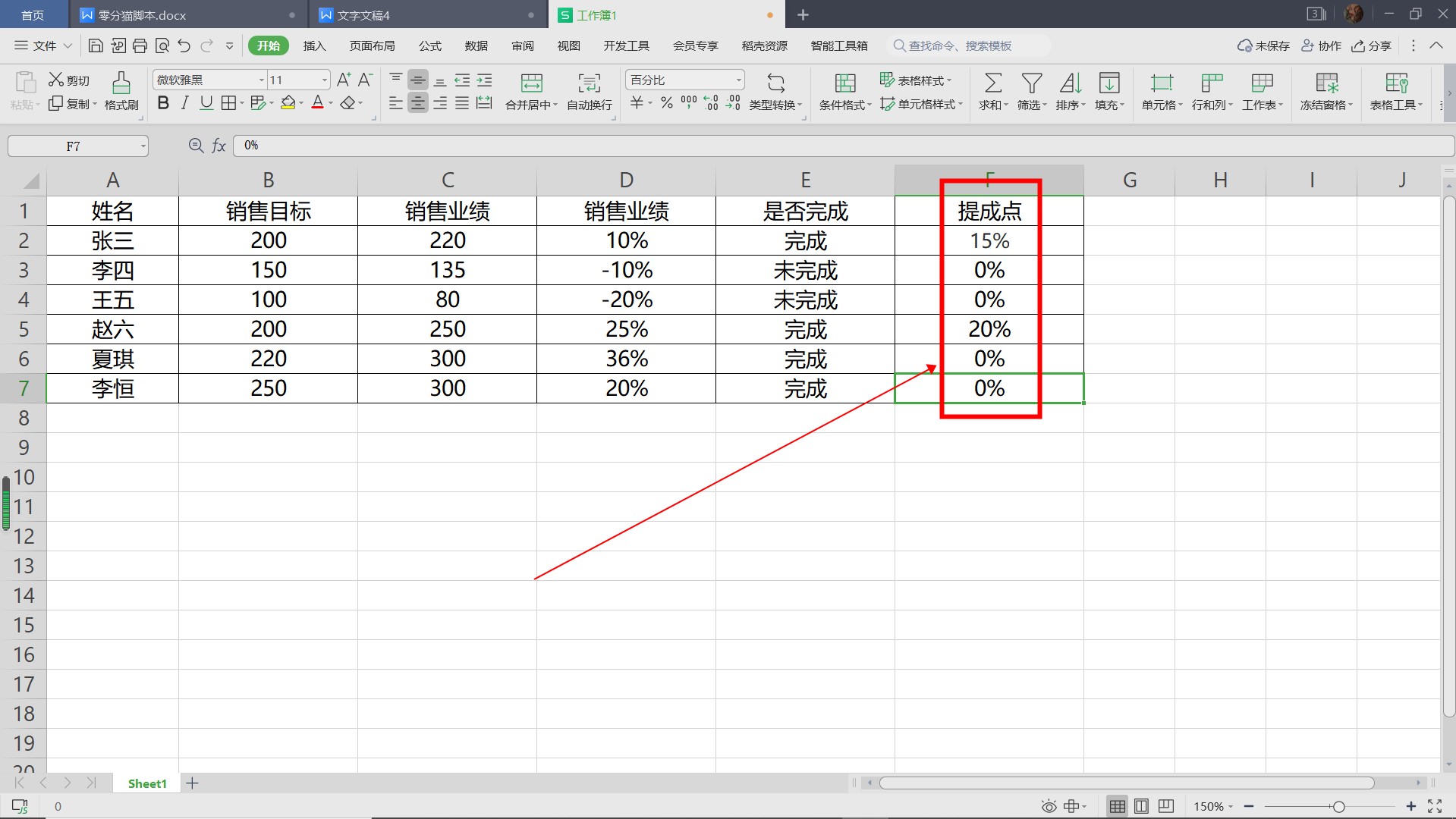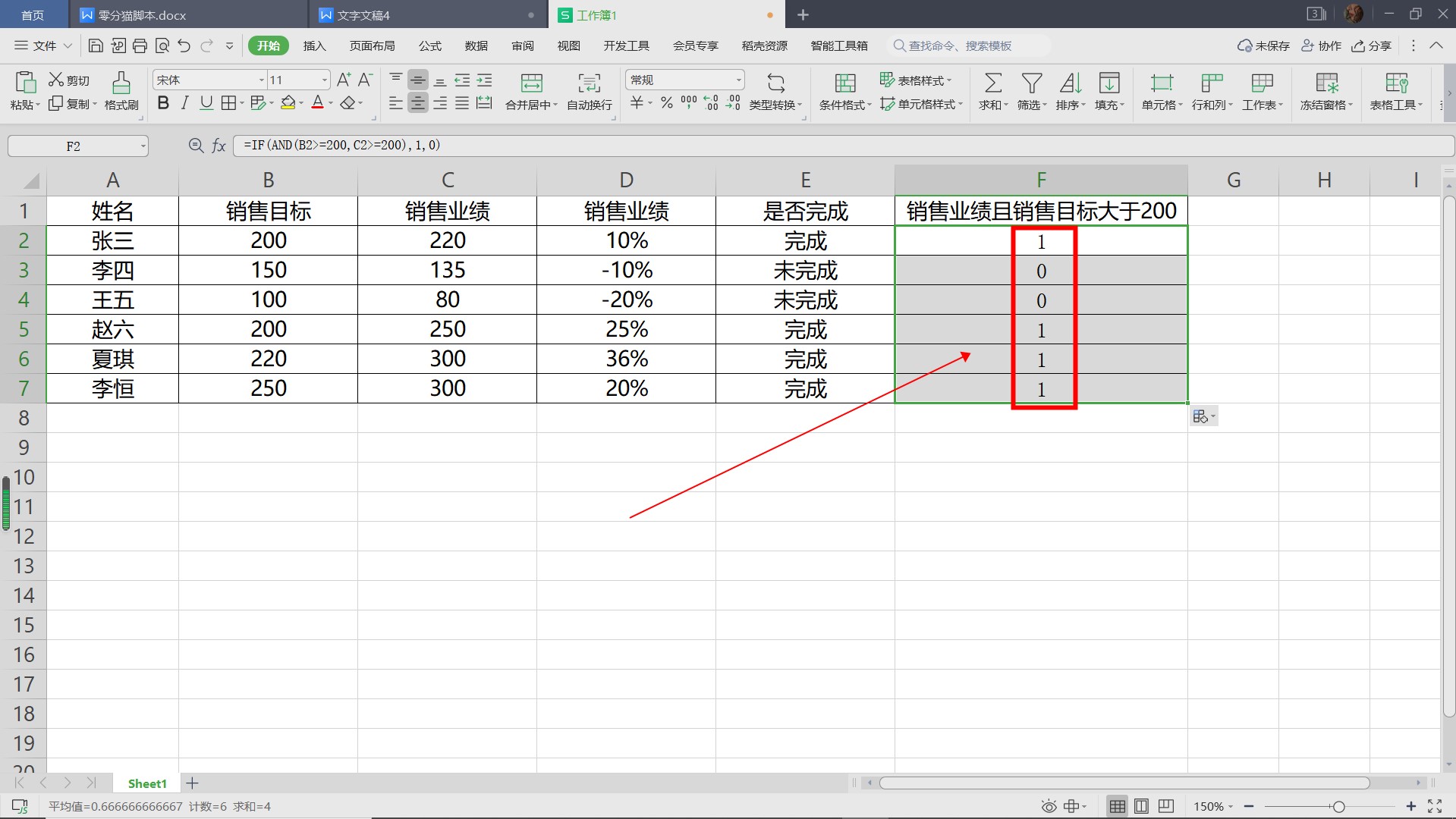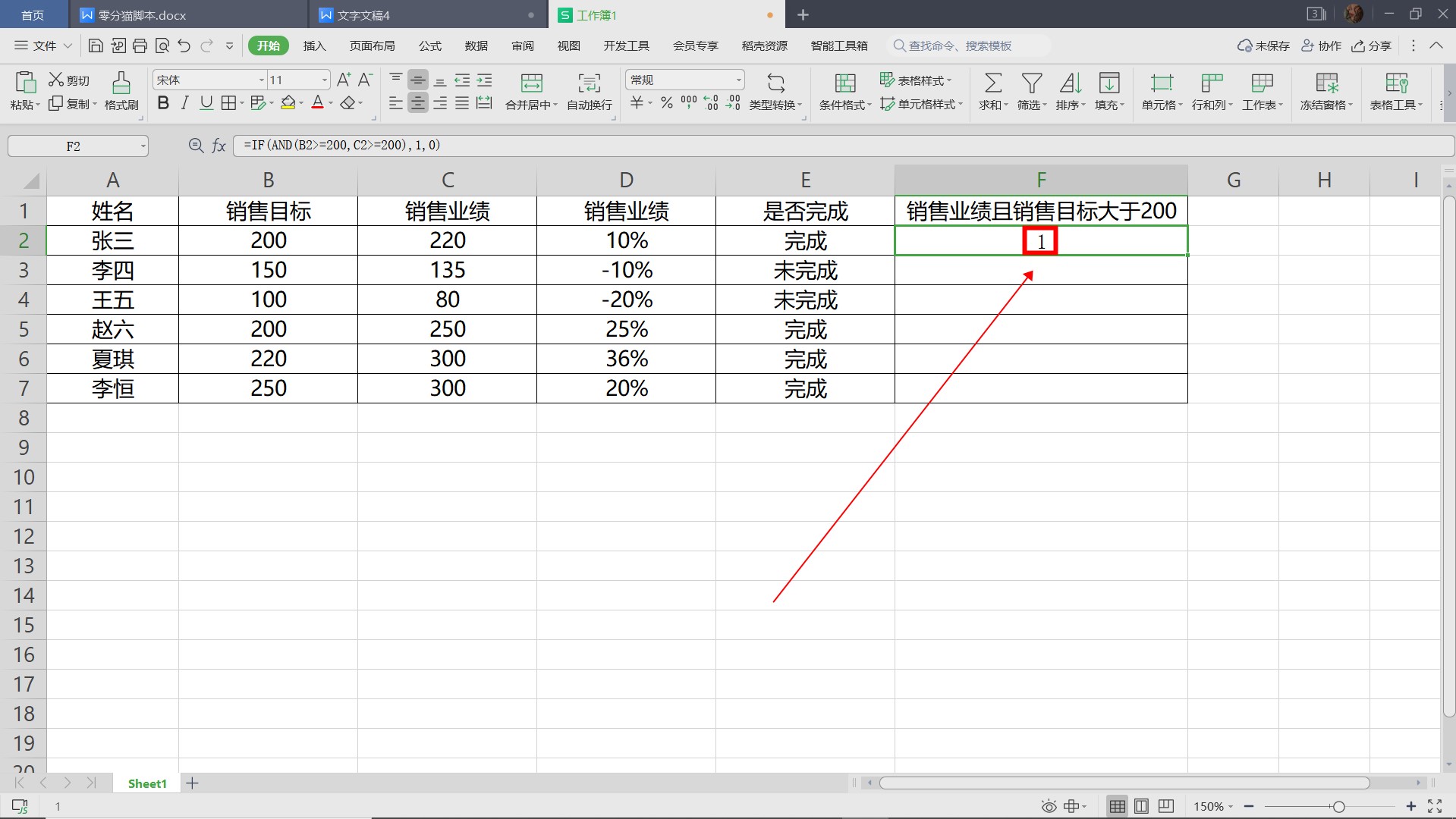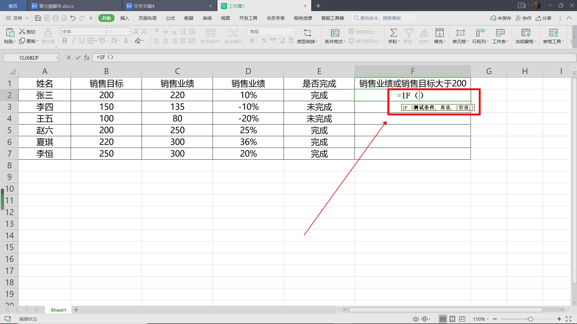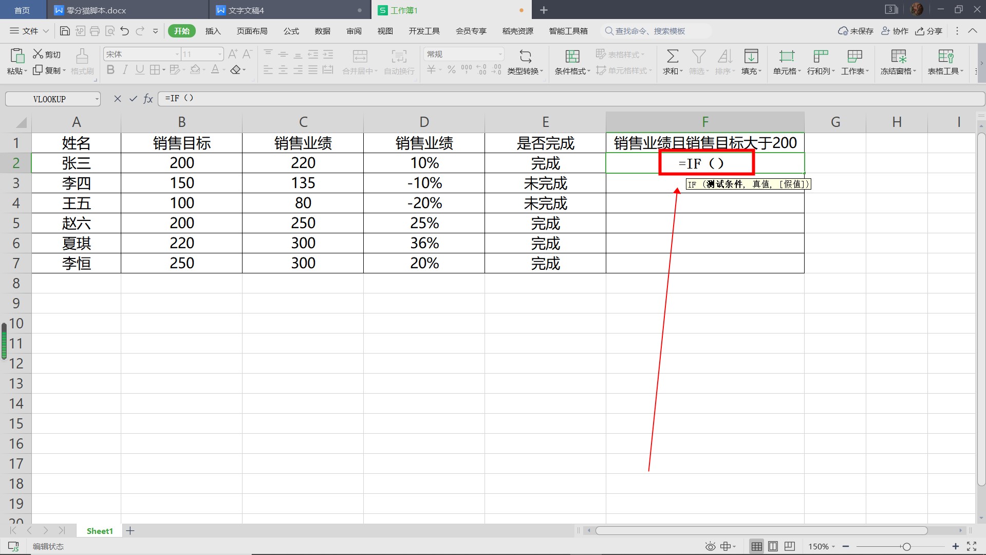 选中单元格输入IF公式需要将满足销售目标和业绩大于200标记为1,选中F2单元格,输入函数公式“=IF()”。