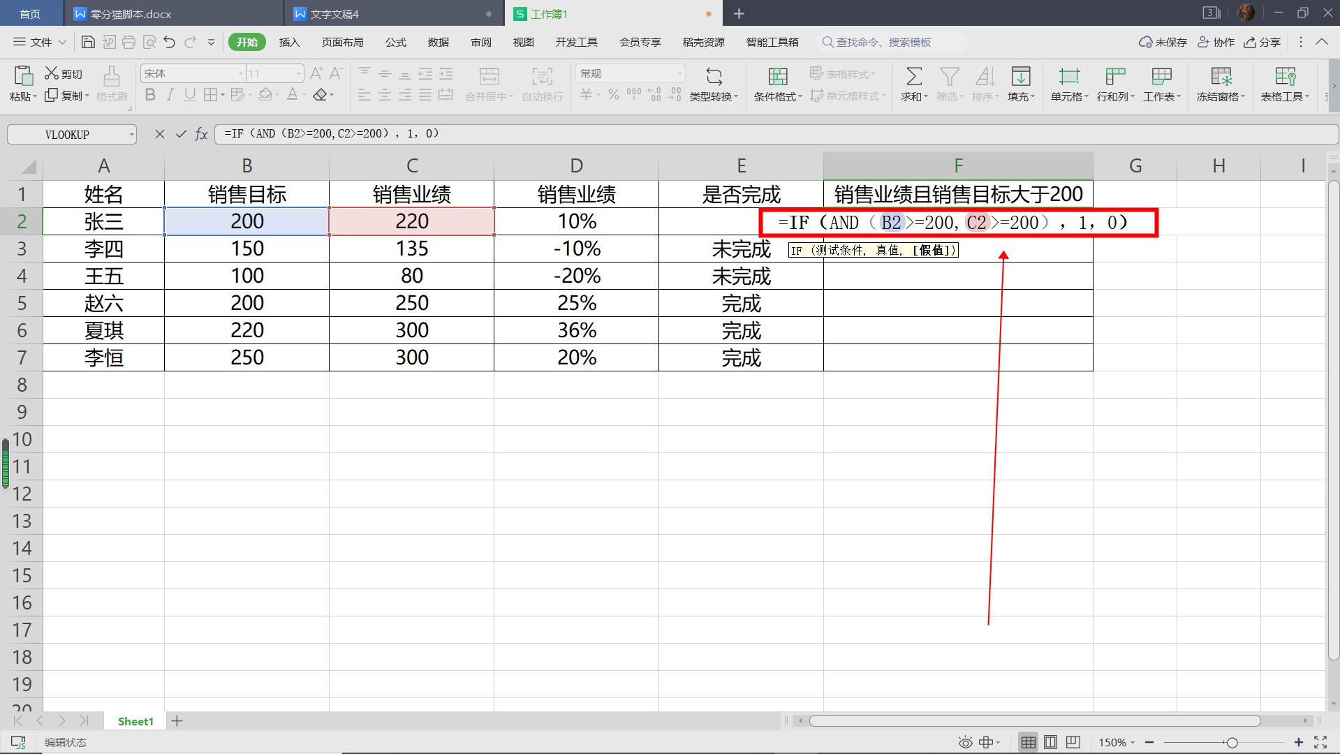输入函数内容然后将光标移至括号内,输入函数内容“AND(B2>=200,C2>=200),1,0”。