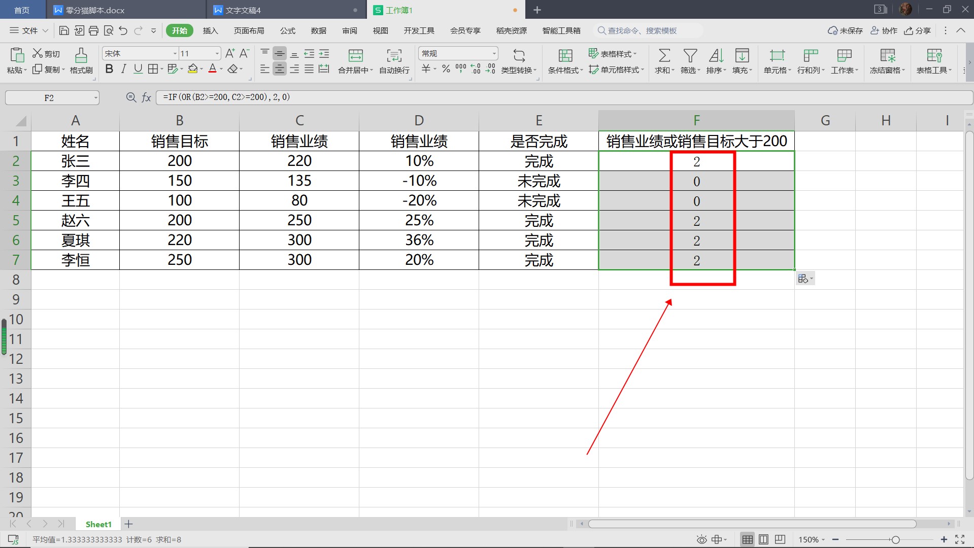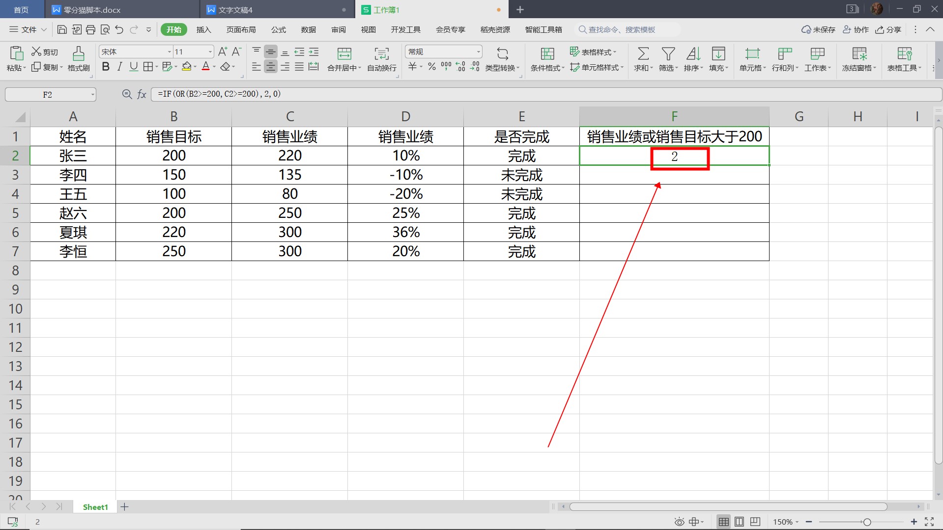 选中单元格输入IF公式需要将满足销售目标或业绩大于200标记为2。选中F2单元格,输入函数公式“=IF()”。