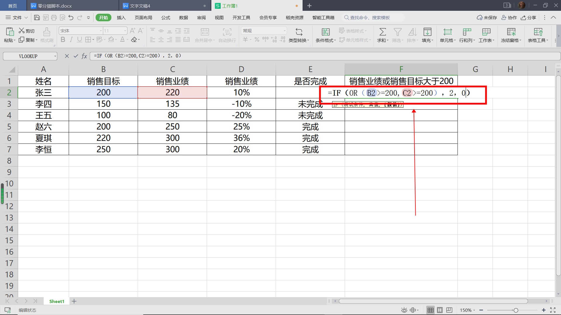 输入函数内容然后将光标移至括号内,输入函数内容“OR(B2>=200,C2>=200),2,0”。