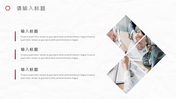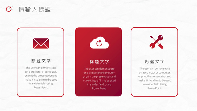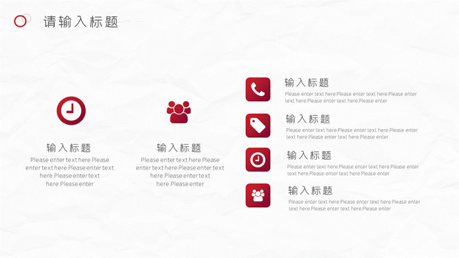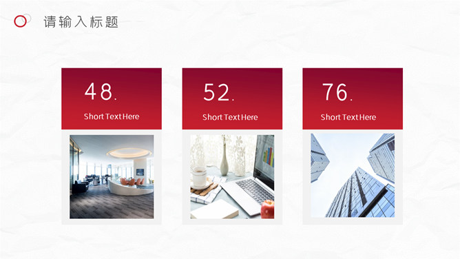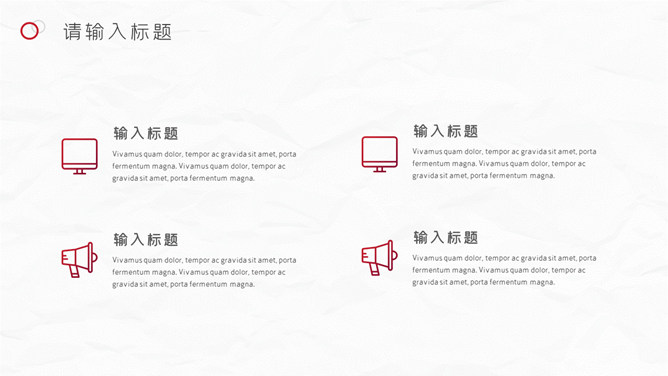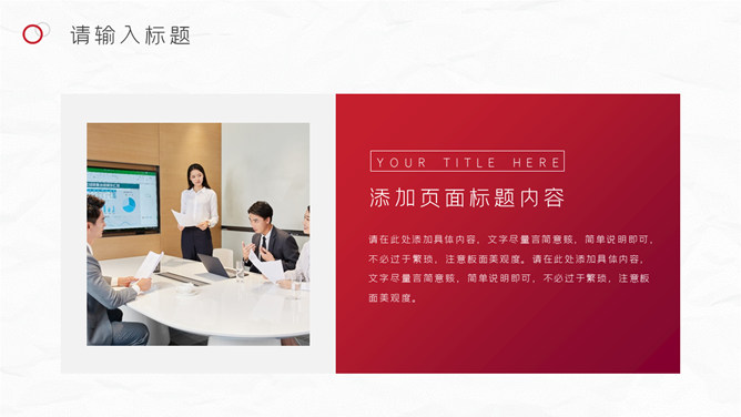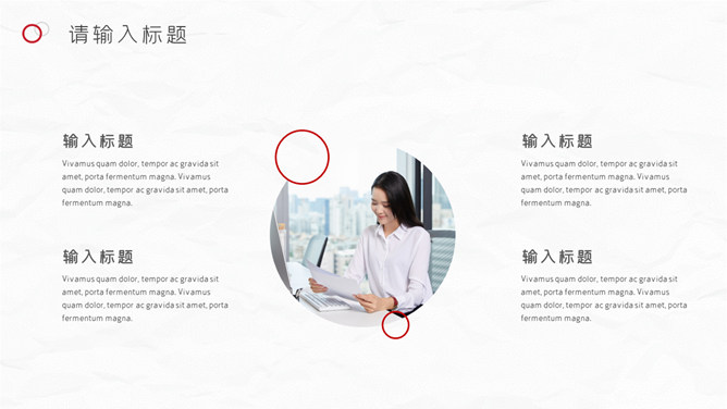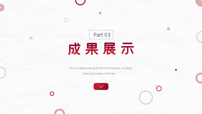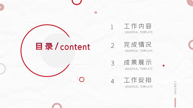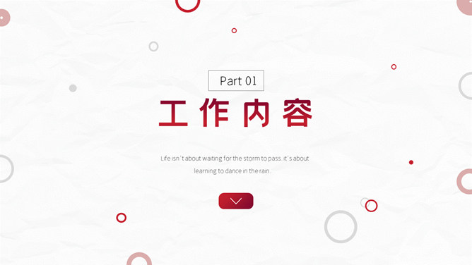 红色圆圈工作总结PPT模板。一套年终工作总结报告幻灯片模板,质感灰白布景,大气红色主色调,圆圈装饰,精约规划。