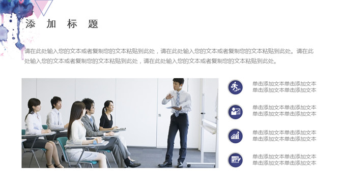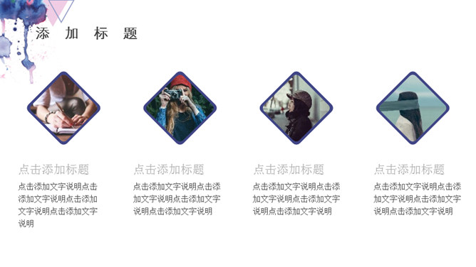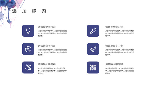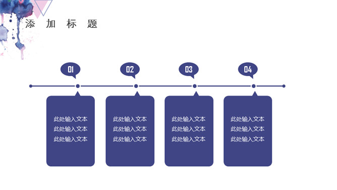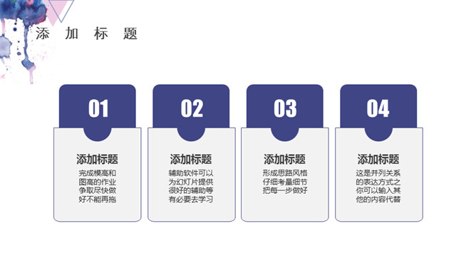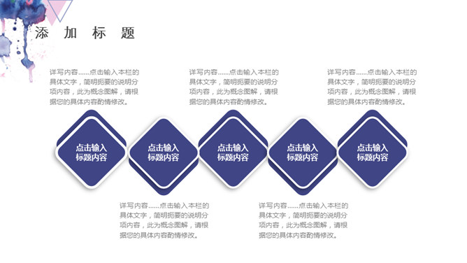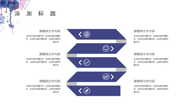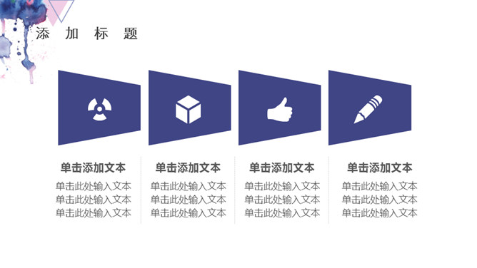时髦通用水彩晕染墨迹PPT模板。一套时髦通用幻灯片模板,水彩晕染墨迹效果背景,动态播放,多图形图表。
