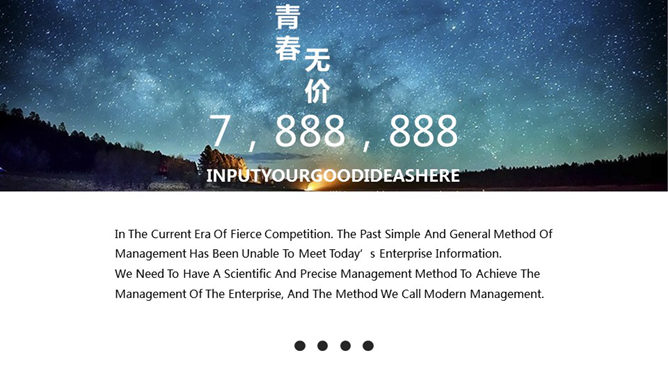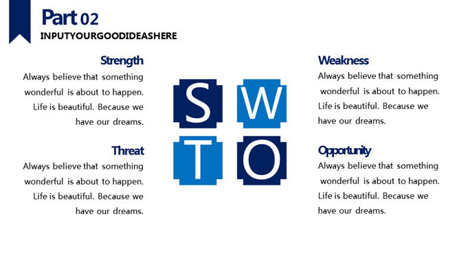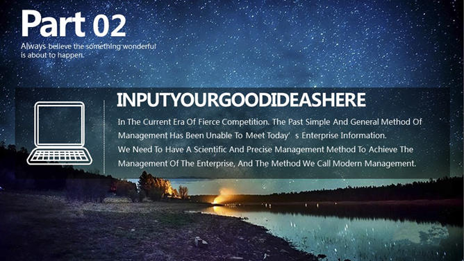 蓝色大气工作报告PPT模板,以蓝色星空为封面背景,大气蓝色主色调,共23页,非常丰富页面类型,包含柱形图、并排联系图、SWOT分析图、山形柱形图、折线图、比照联系等。
