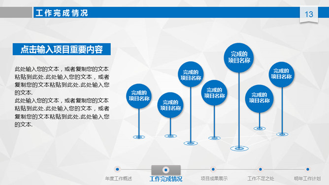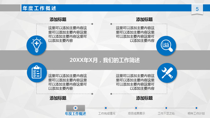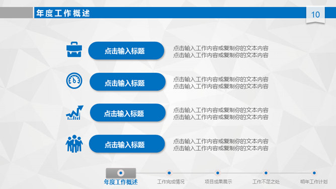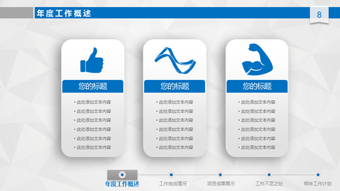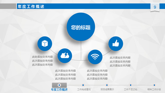 大气工作总结方案汇报PPT模板。一套工作总结方案汇报陈述幻灯片模板,大气蓝色主色调,共45页,页面丰厚实用。