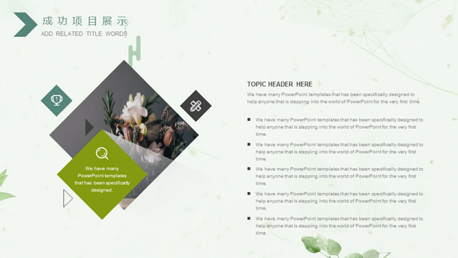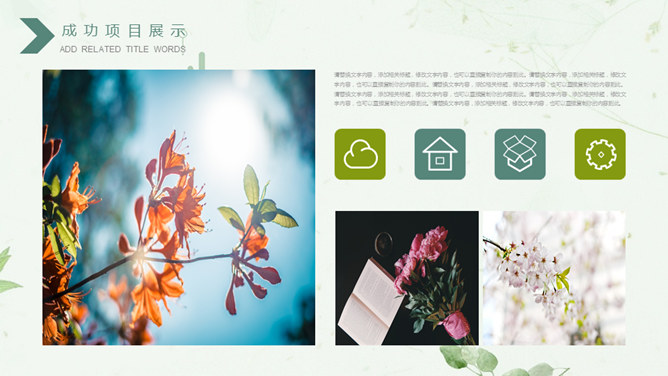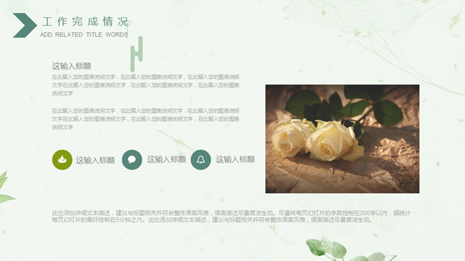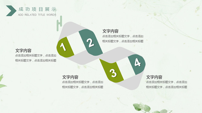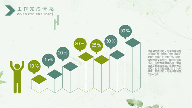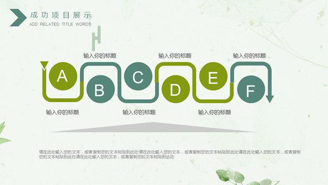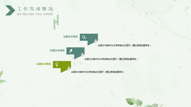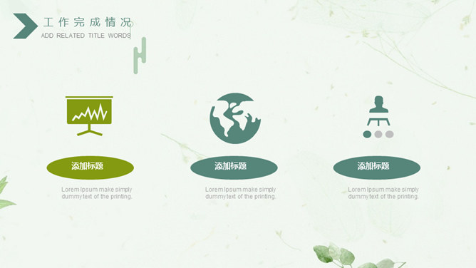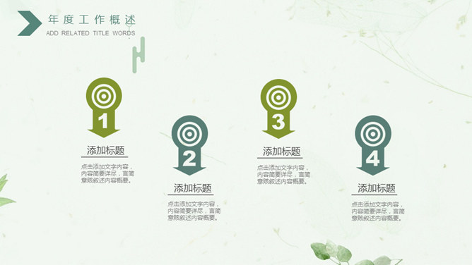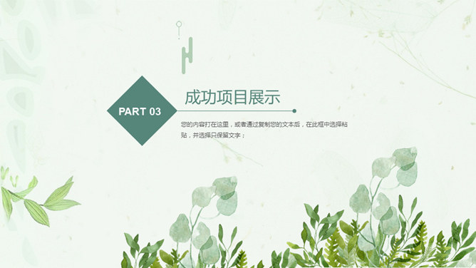 清新绿色工作汇报PPT模板。一套工作总结汇报幻灯片模板,清新绿色水彩绿叶装修,框架结构完好,动态播映。