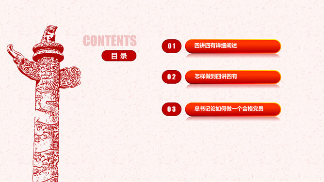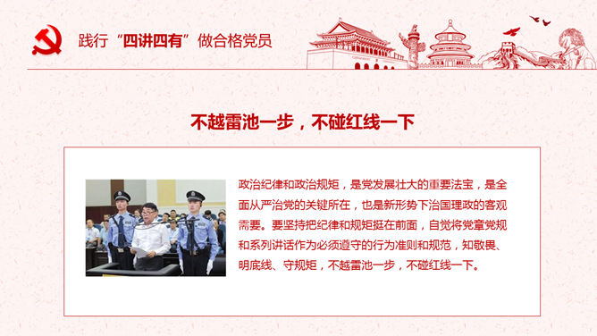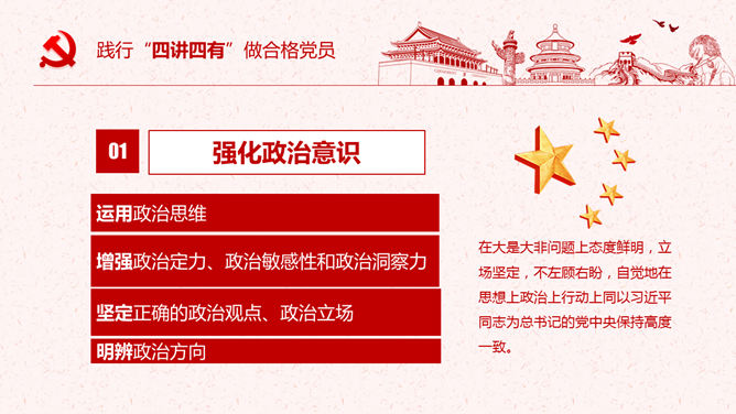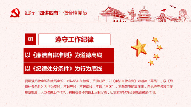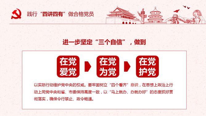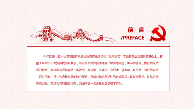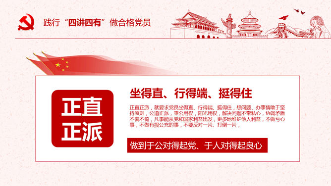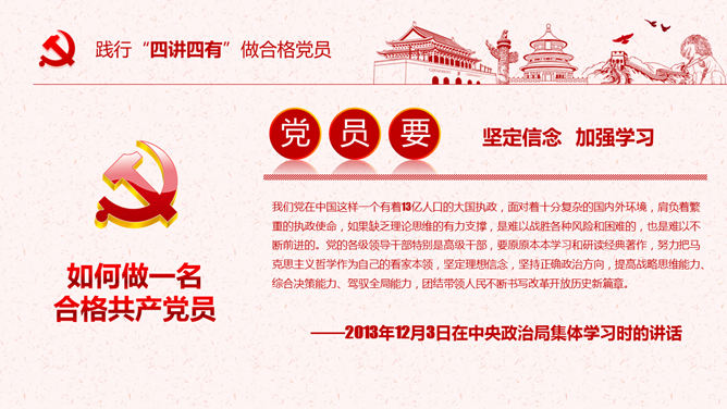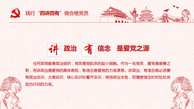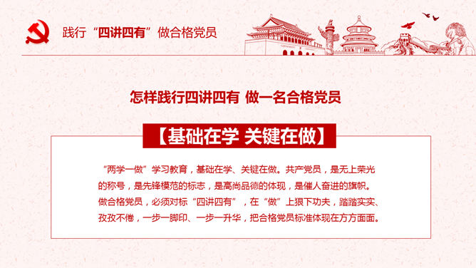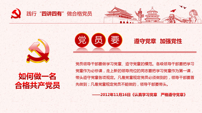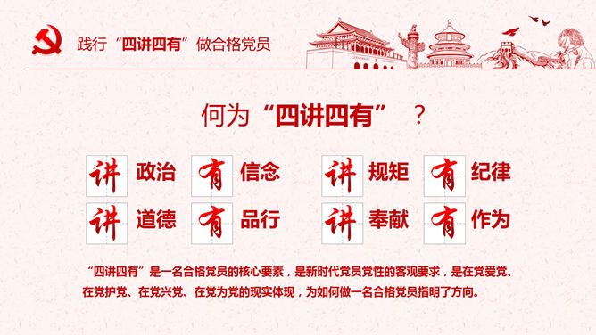 饯别四讲四有做合格党员PPT模板。一套四讲四有课件幻灯片模板,大气精巧规划,也修改后用于其他党建主题。