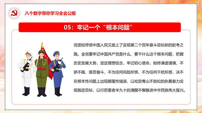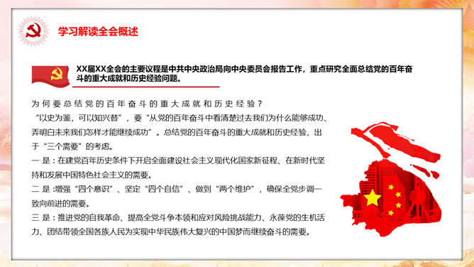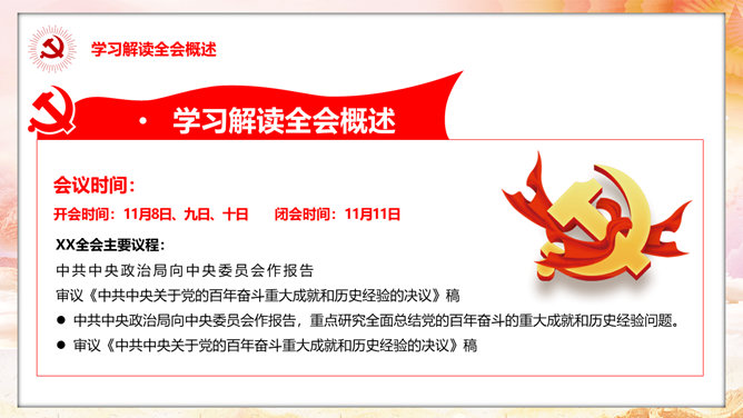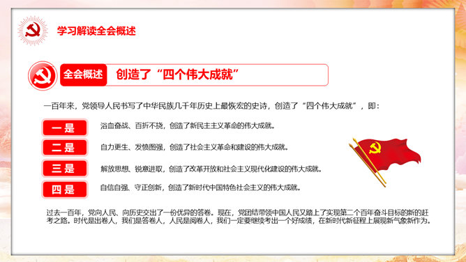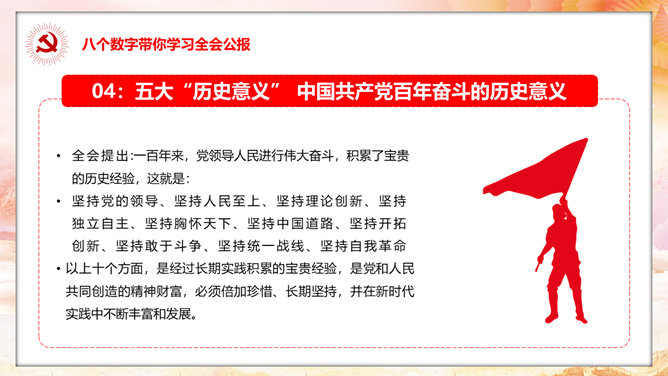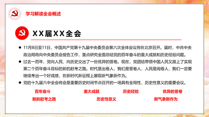 学习遵循十九届六中全会PPT模板。学习解读全会概述、八个数字带你学习全会公报、百年奋斗的历史意义和历史经验、为何要总结党百年奋斗的重大成就和历史经验、党的百年奋斗进程、十八大以来党和国家事业取得的历史性成就。
