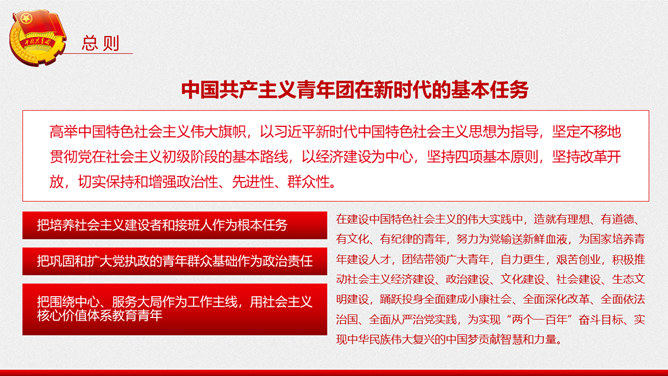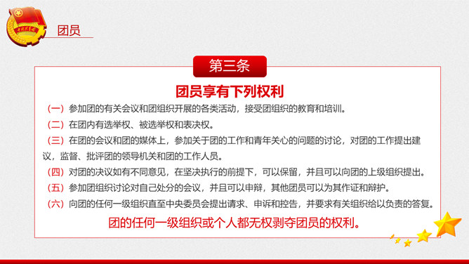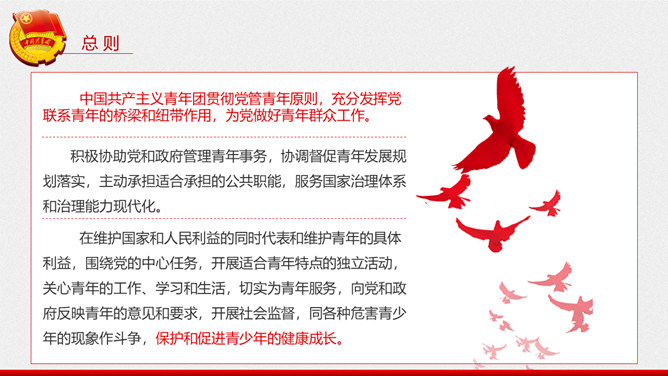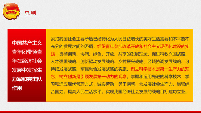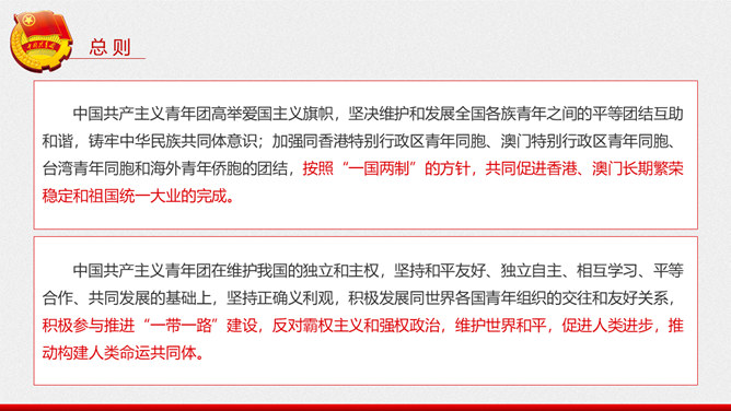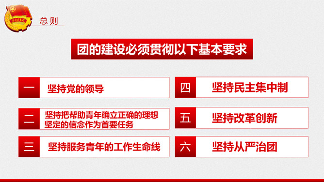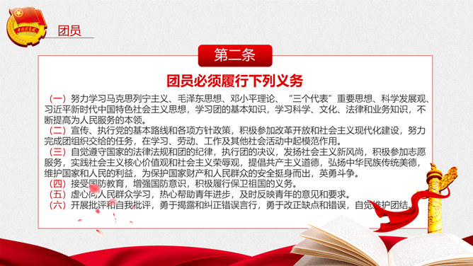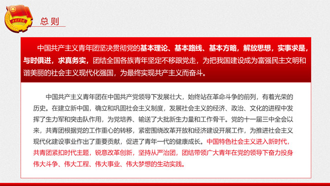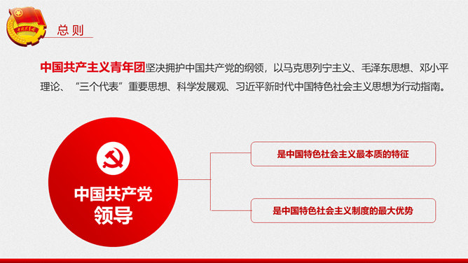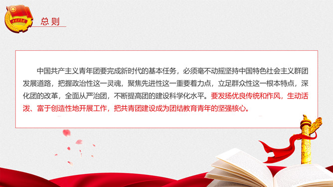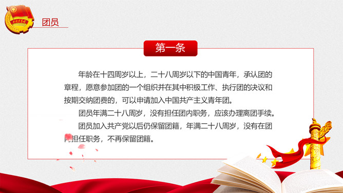 团员共青团章程PPT模板。包括团的安排准则、团的中心安排、团的地方安排、解放军和武警部队中团的安排、团同少年先锋队的联系等。