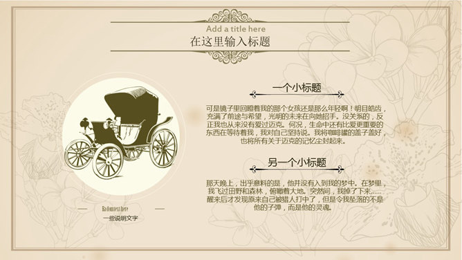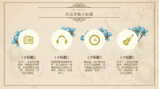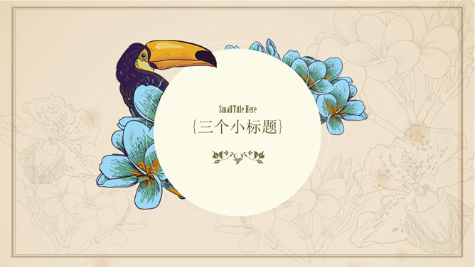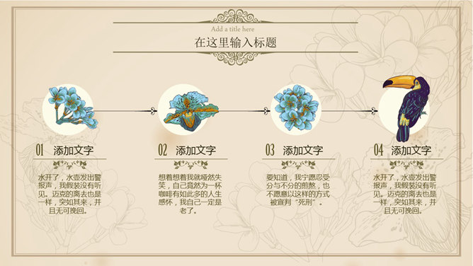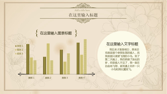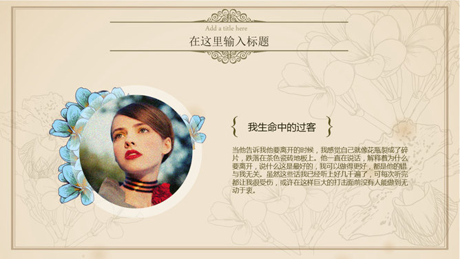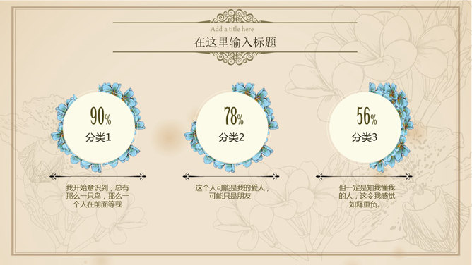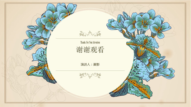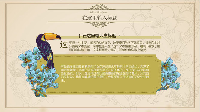 文艺小新鲜欧式复古PPT模板。一份新鲜欧式复古风格幻灯片模板,复古花纹、配色、字体等元素设计,动态播映效果。