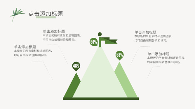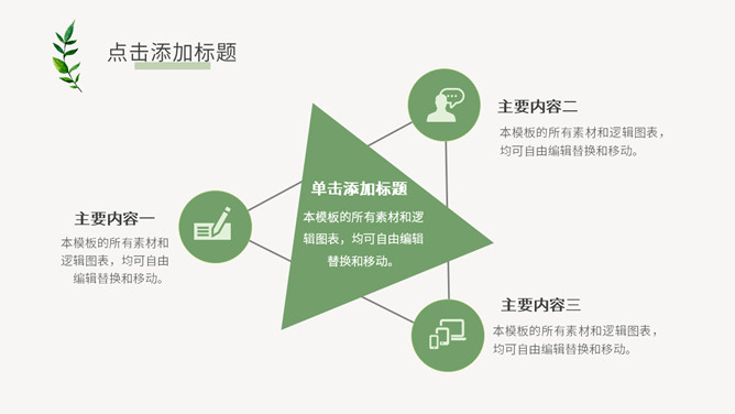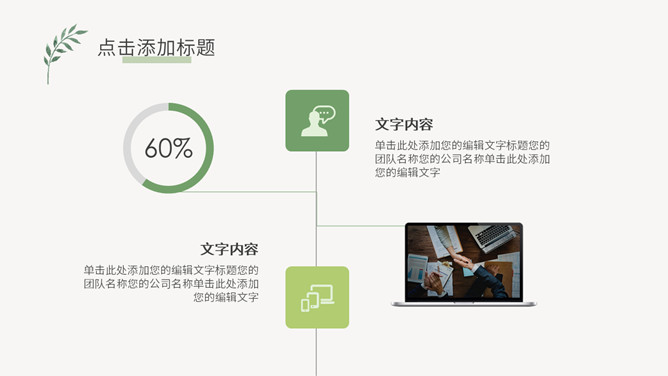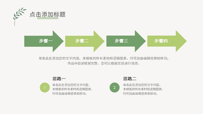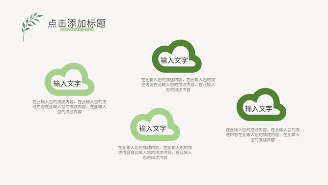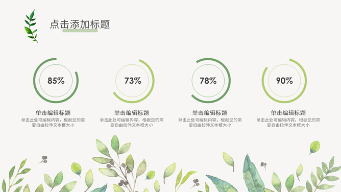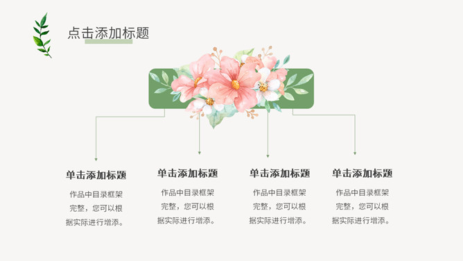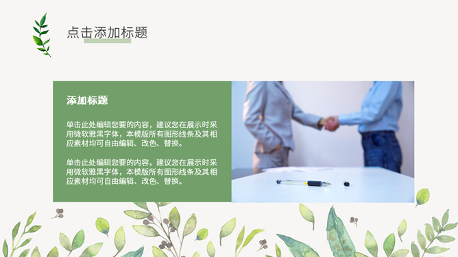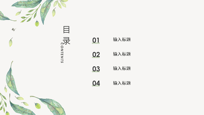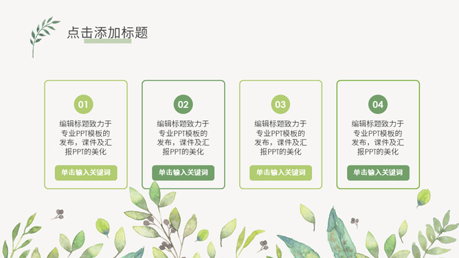 简洁小新鲜文艺范PPT模板。一套小新鲜风格幻灯片模板,水彩叶子花朵装饰,淡绿色配色,精约新鲜,很有文艺范。