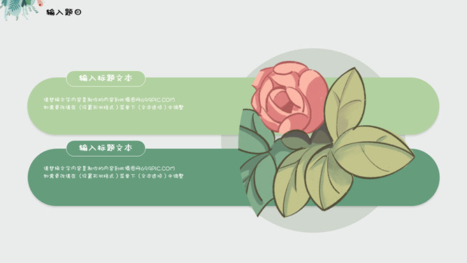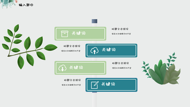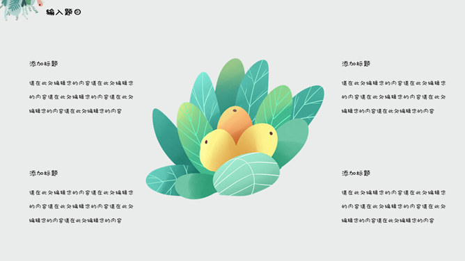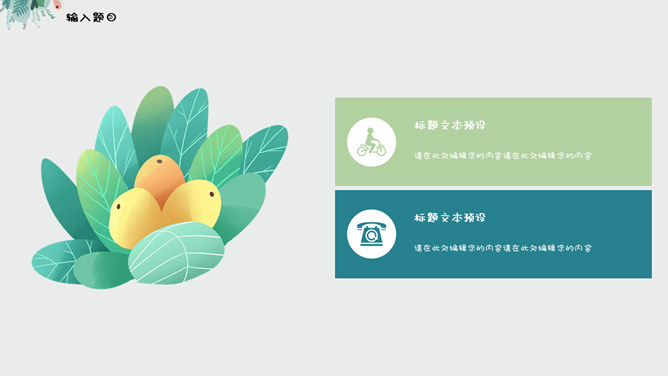 夏日唯美浓艳小新鲜PPT模板。一套夏日小新鲜幻灯片模板,绿色植物素材装饰,浓艳唯美,运用字体:汉仪乐喵体W。