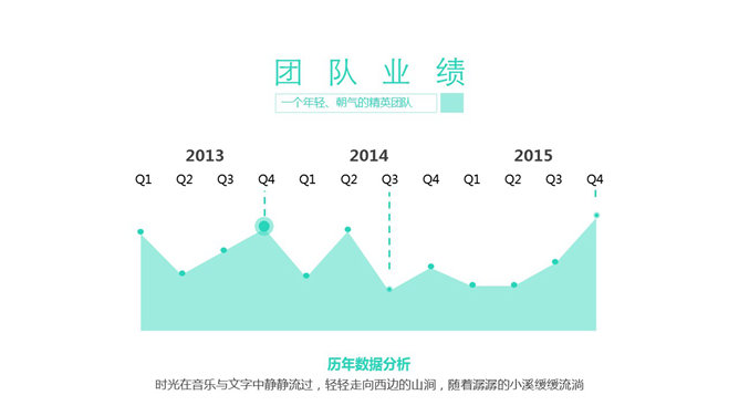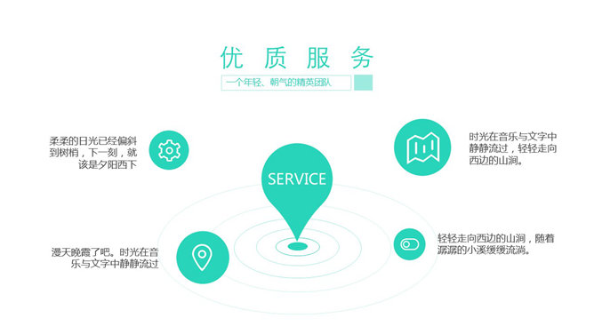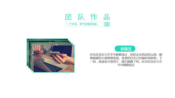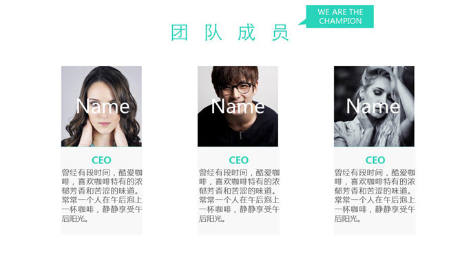 一份精巧时尚的团队介绍PPT模板,扁平化、全图型设计,包含团队成员简介、团队阅历、客户人群、提供的服务、团队业绩、团队著作、联系方式等页面,包含动态和静态两个版本。