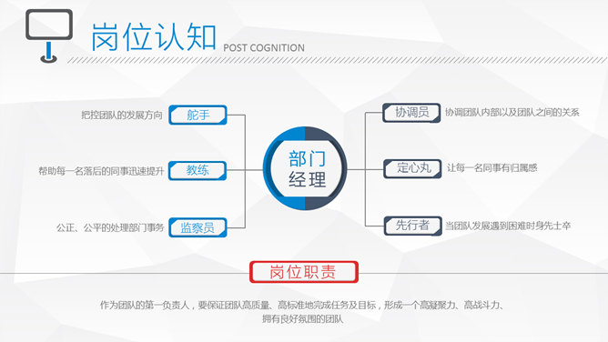 竞聘讲演述职陈述PPT模板。一份简练时尚的述职陈述竞聘讲演幻灯片模板,新鲜蓝红配色,低面多边形布景,个人状况简介、岗位认识、职业现状、团队建造、遇到问题和解决方案等部分。