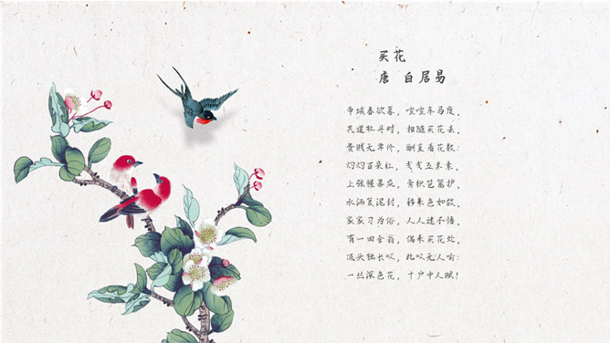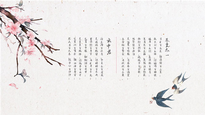 春天燕子中国风诗歌朗读PPT模板。一套唯美中国风幻灯片模板,桃花、燕子等春天元素装饰,适合古诗词朗读等。