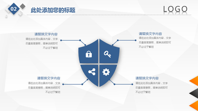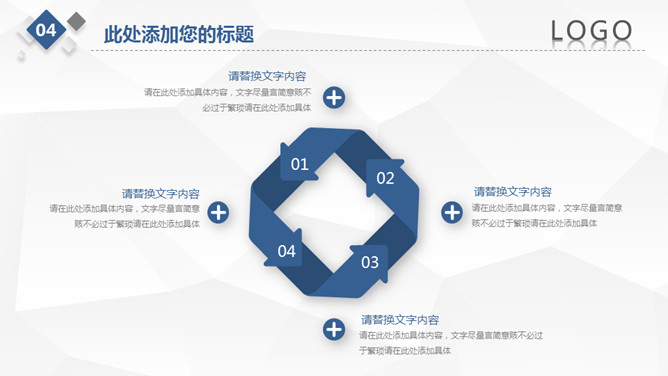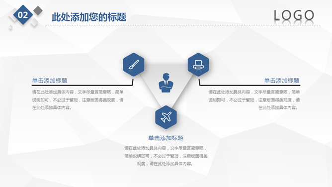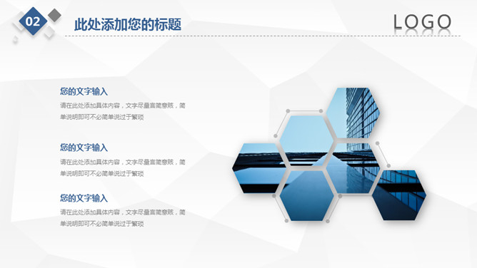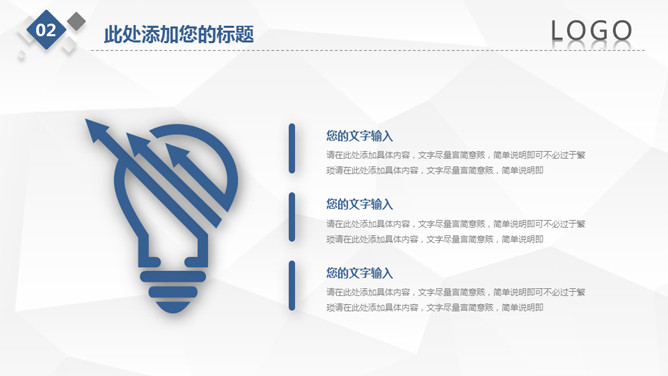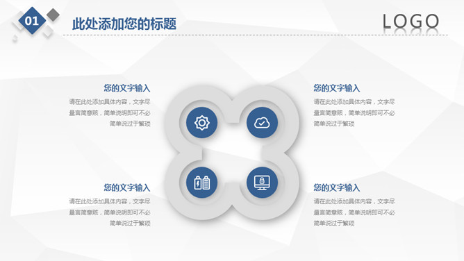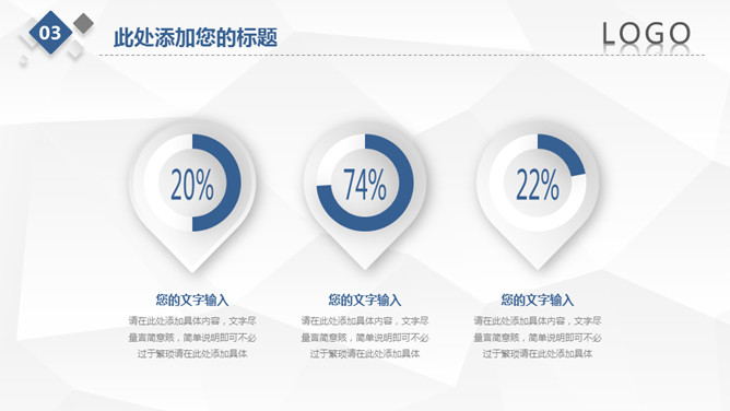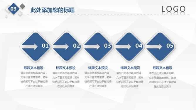 精约微立体工作总结PPT模板。一套工作总结汇报幻灯片模板,浅灰低面多边形背景,大气蓝色主色调,微立体效果。
