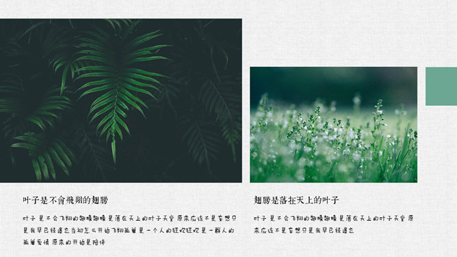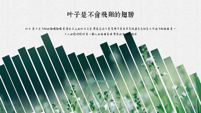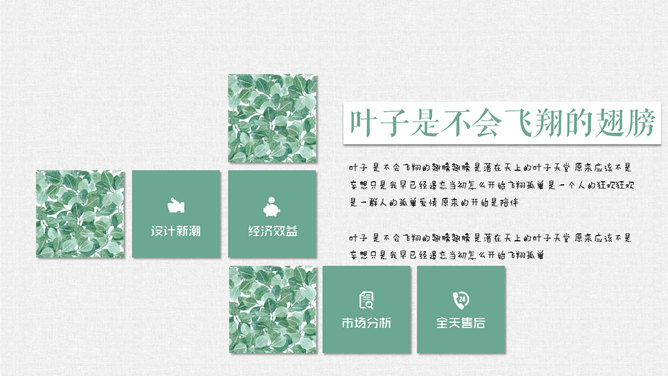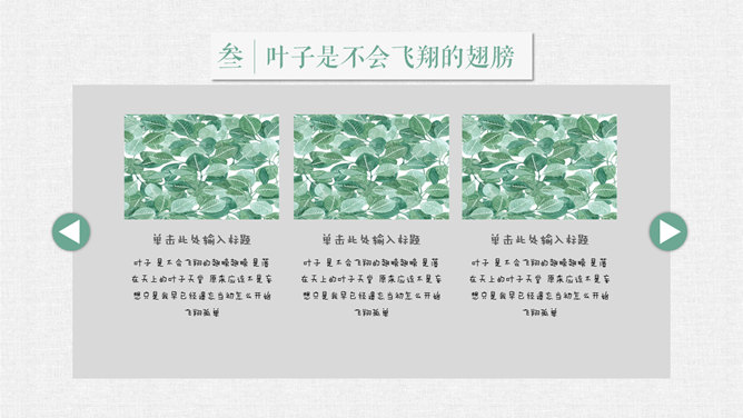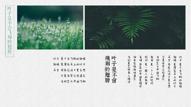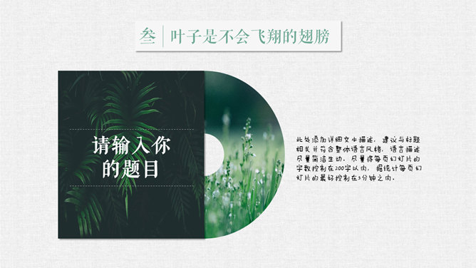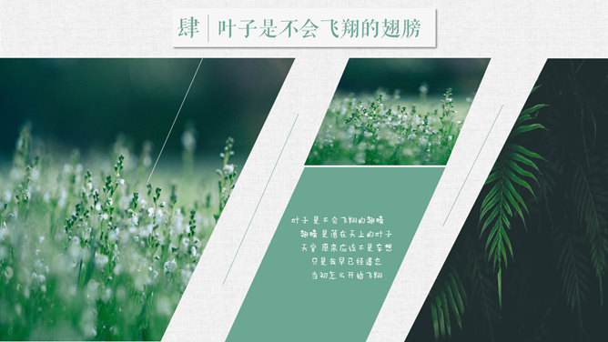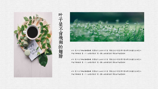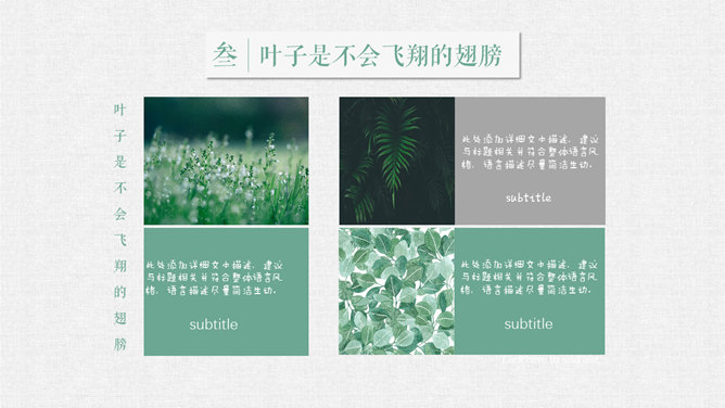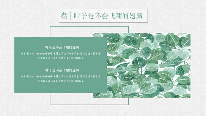 新鲜文艺森系叶子PPT模板。一套绿色植物主题幻灯片模板,文艺森系规划,多图文排版页面,新鲜浓艳。