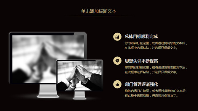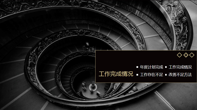 高端黑金作业总结计划PPT模板。一套年终作业总结暨作业计划幻灯片模板,高端大气黑金配色,页面丰厚实用,框架结构完整,动态演示作用。