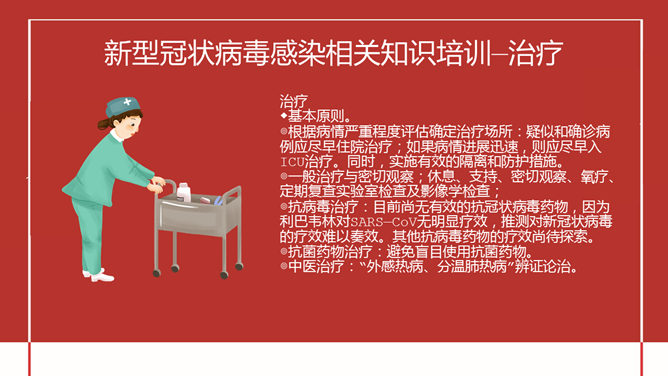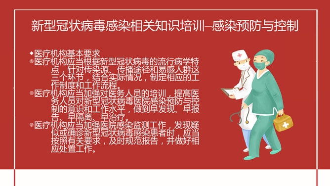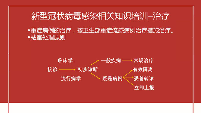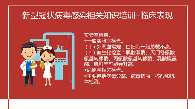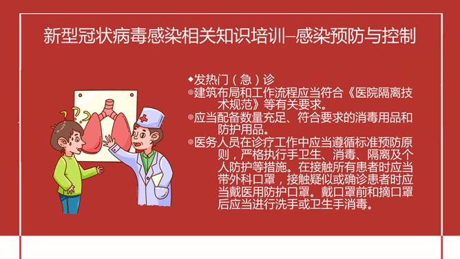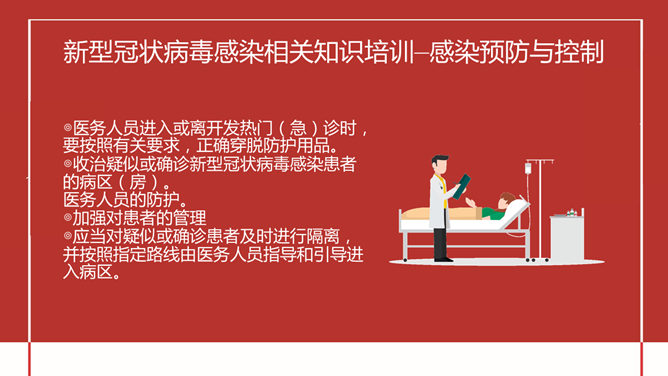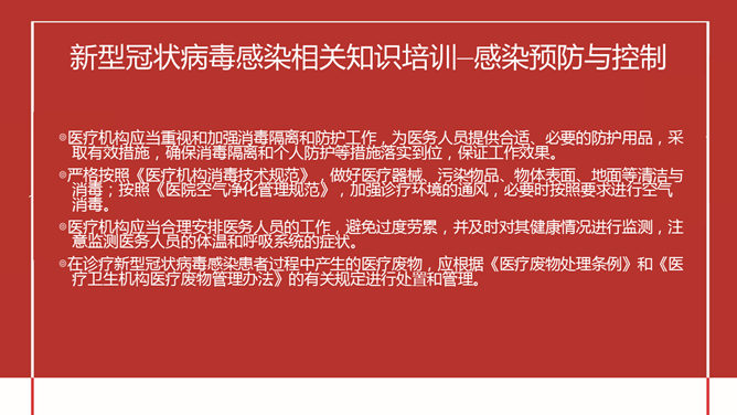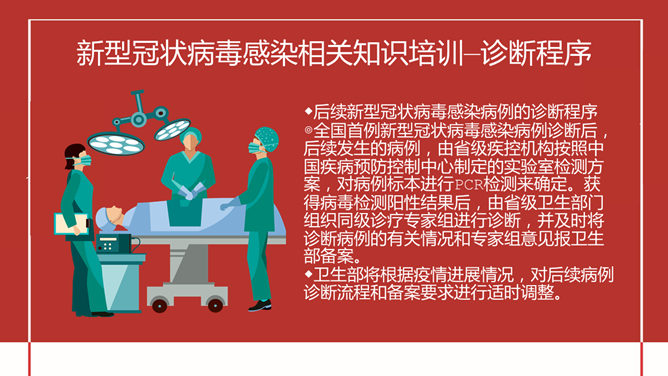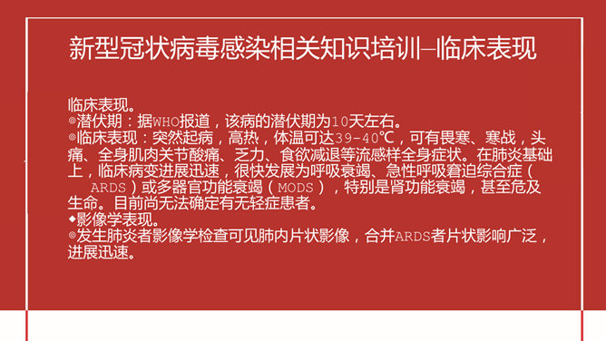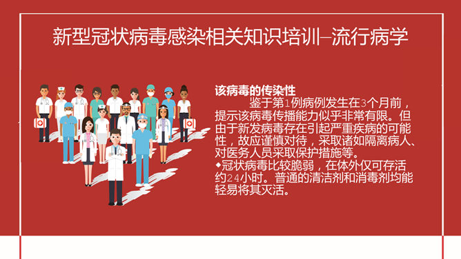 新型冠状病毒知识训练PPT模板。包括前语、流行病学、临床表现、临床诊断、感染预防与操控、诊断程序几个部分。