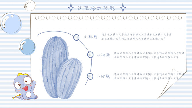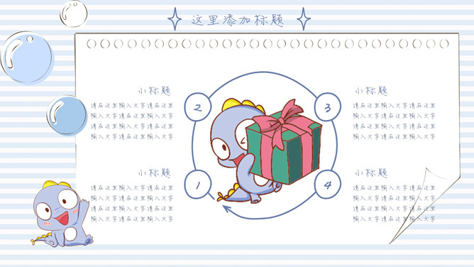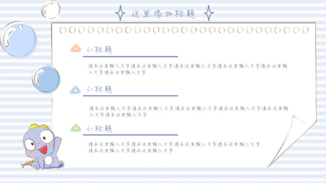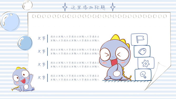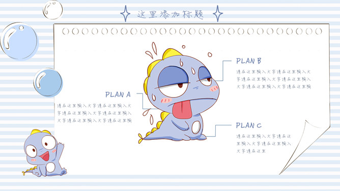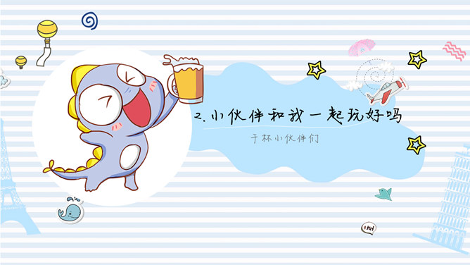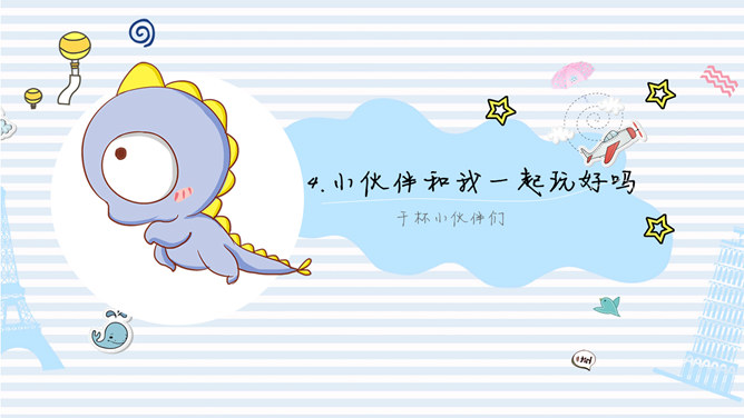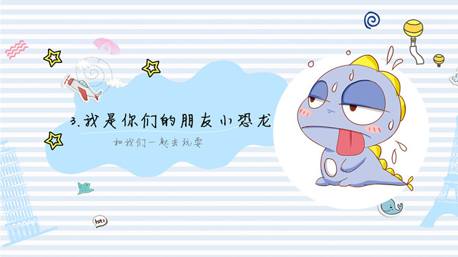 心爱卡通小恐龙PPT模板。一套卡通风格幻灯片模板,心爱俏皮小恐龙主题设计,合适儿童相关主题。建议安装字体:方正静蕾简体。
