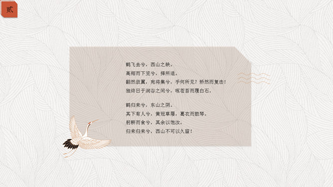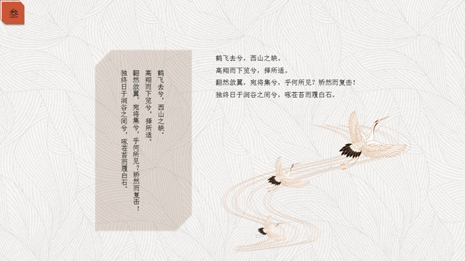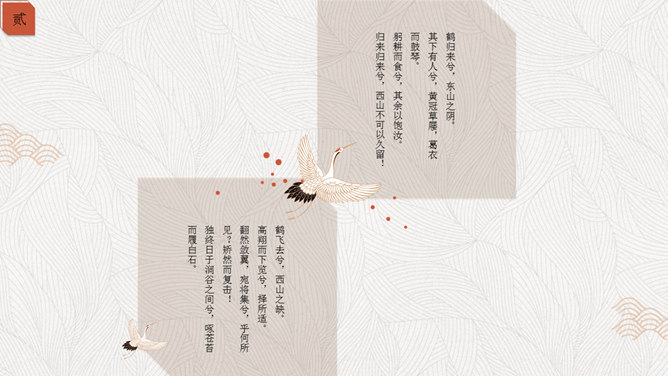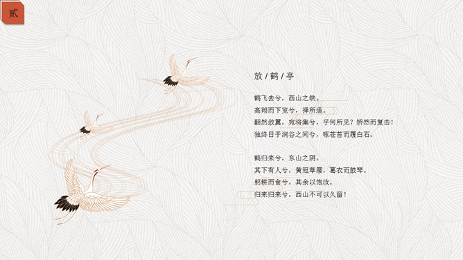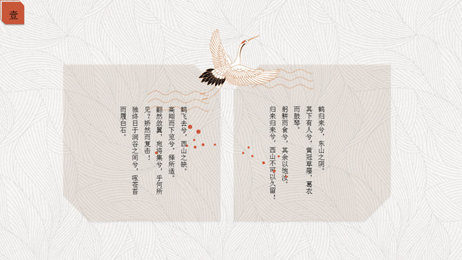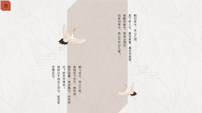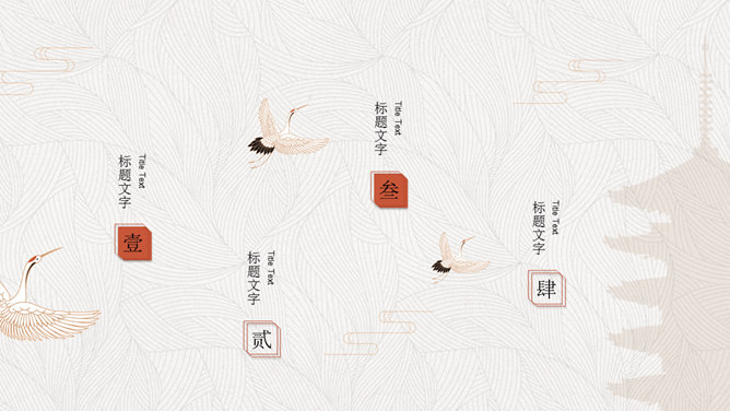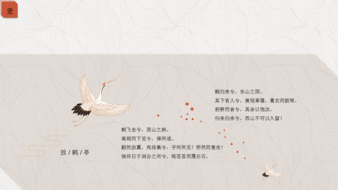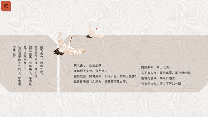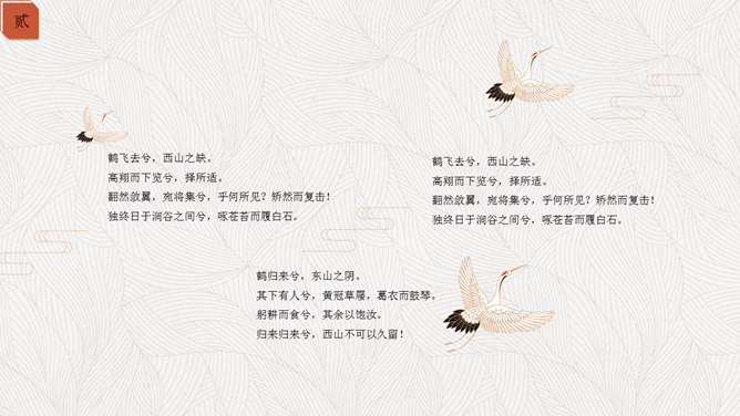 精约高雅仙鹤中国风PPT模板。一套古典中国风幻灯片模板,以仙鹤、云纹等为主要设计元素,精约高雅效果。