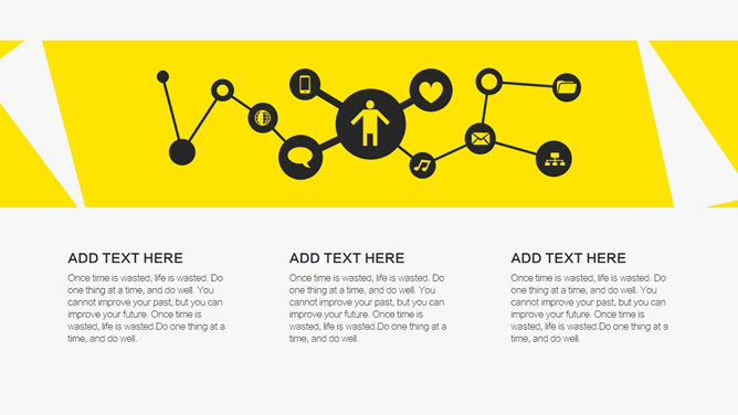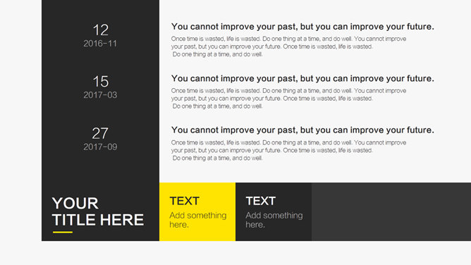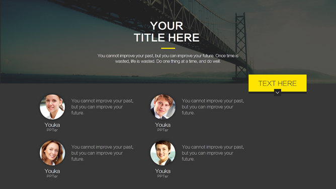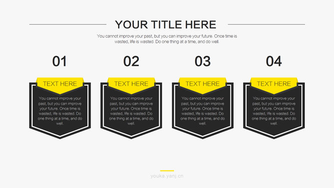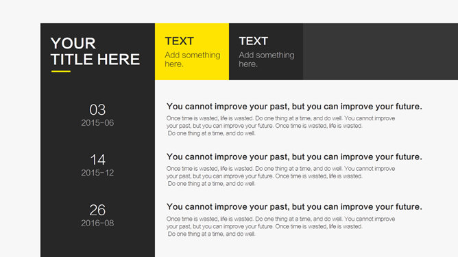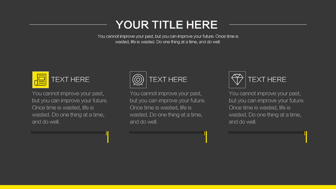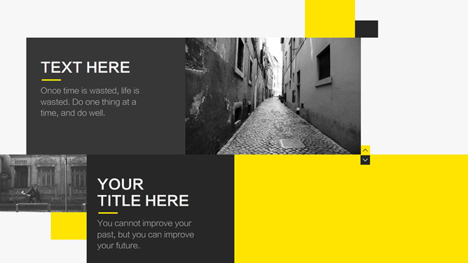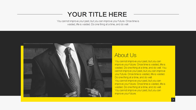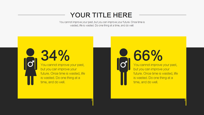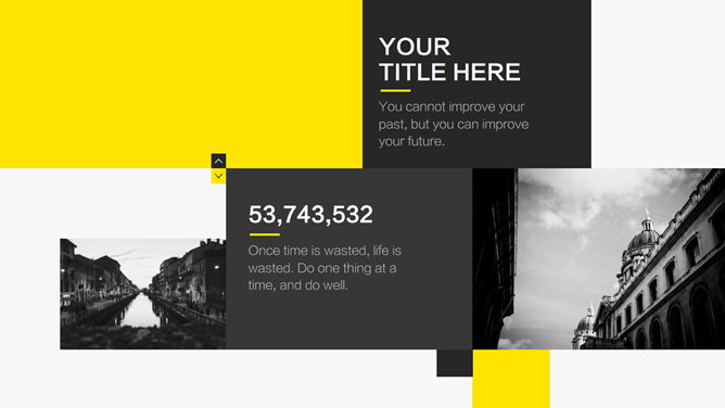 黑黄撞色时尚杂志风PPT模板。一套精巧的商务幻灯片模板,采用经典的黑黄撞色调配,欧美杂志风格设计。建议安装字体:方正兰亭粗黑_GBK、方正兰亭纤黑_GBK。