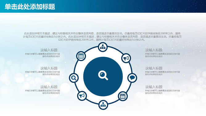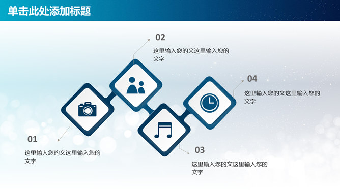 简约通用工作报告PPT模板。一套精美通用工作总结汇报幻灯片模板,蓝色梦境光影光斑布景,IOS规划风格。