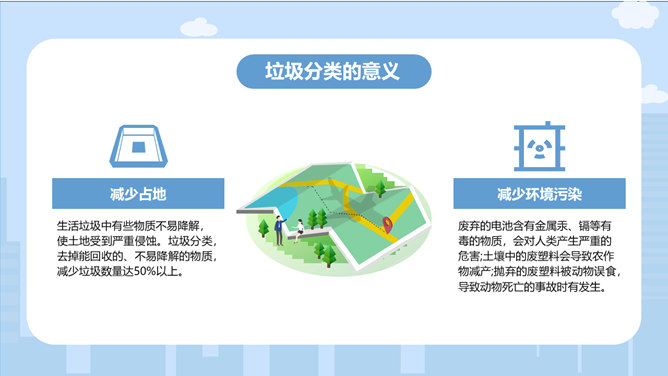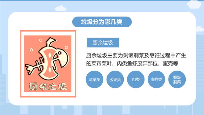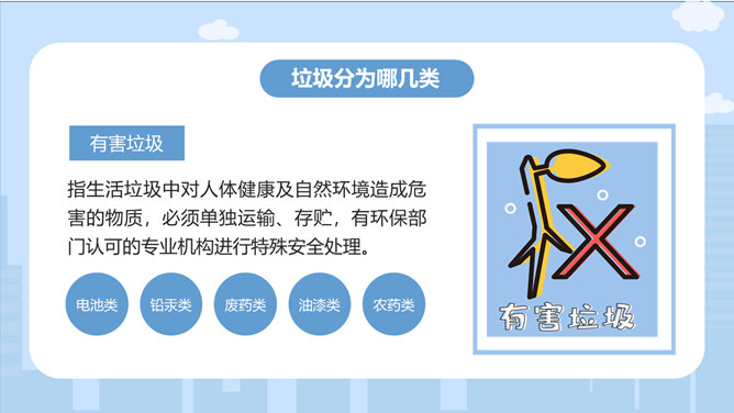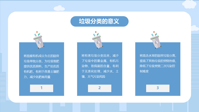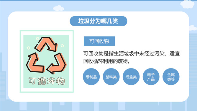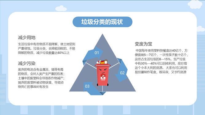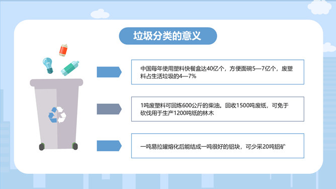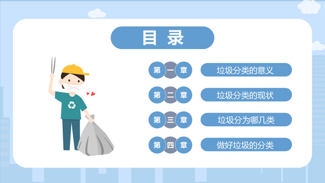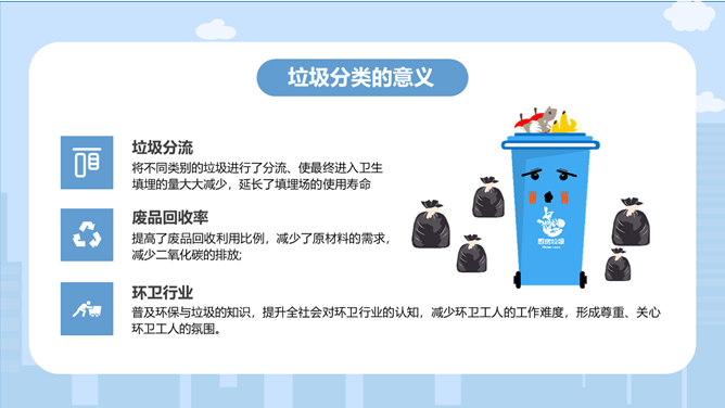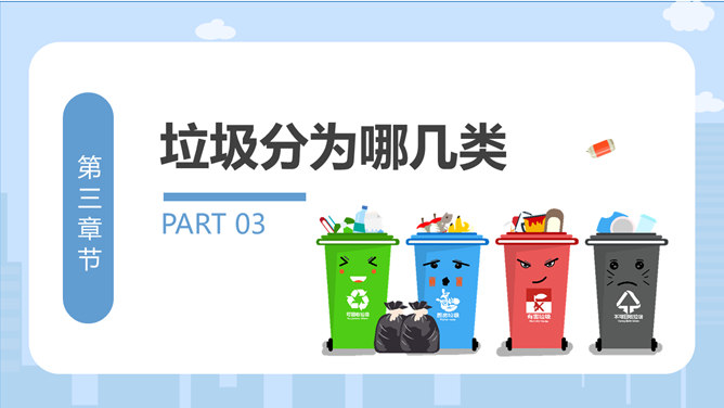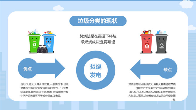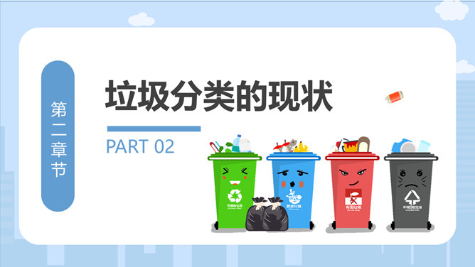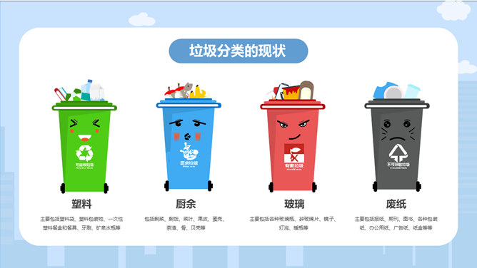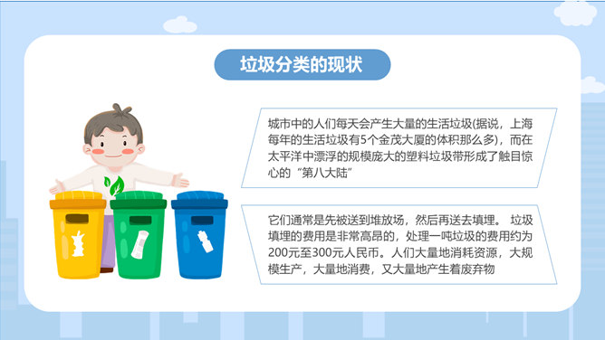 废物分类常识训练PPT模板。精约卡通规划风格,包括废物分类的含义、现状和如何做好废物的分类。