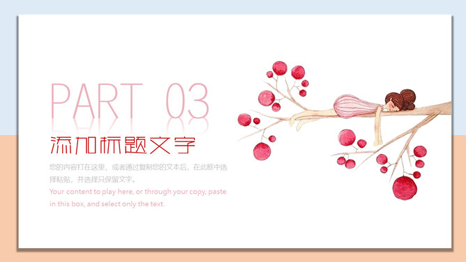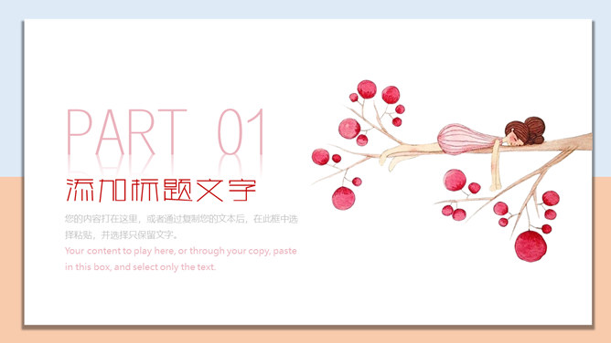 唯美新鲜树枝女孩PPT模板。一套简练新鲜幻灯片模板,悬浮卡片效果,躺在树枝上的女孩装饰,神话唯美。