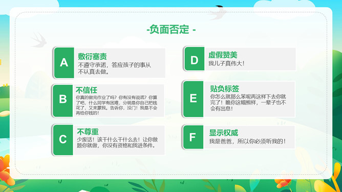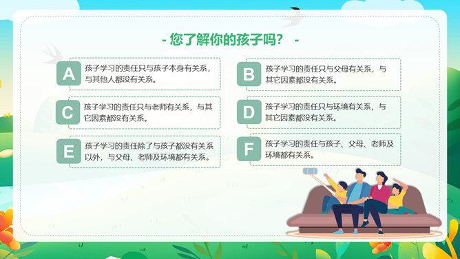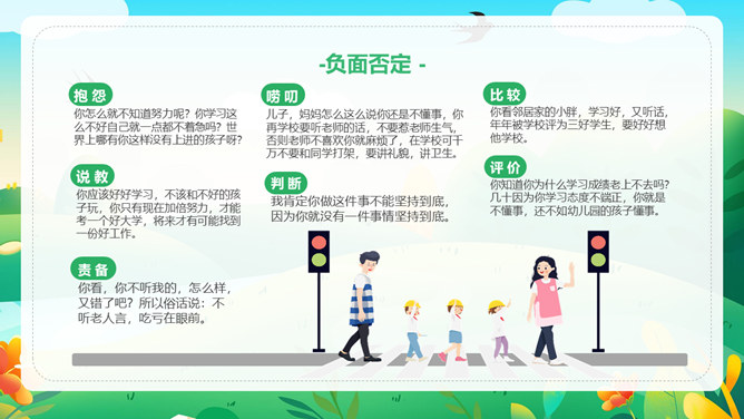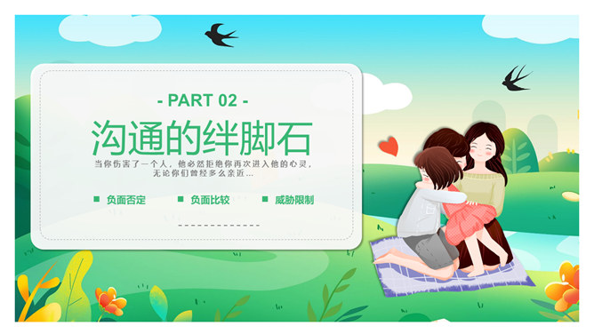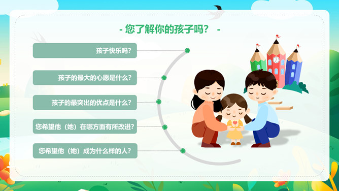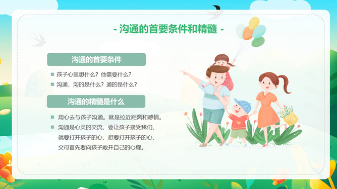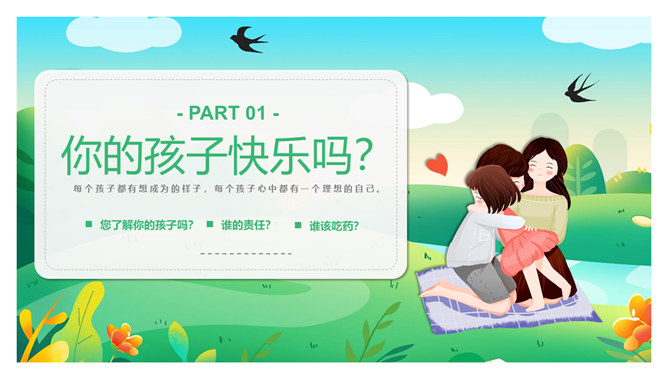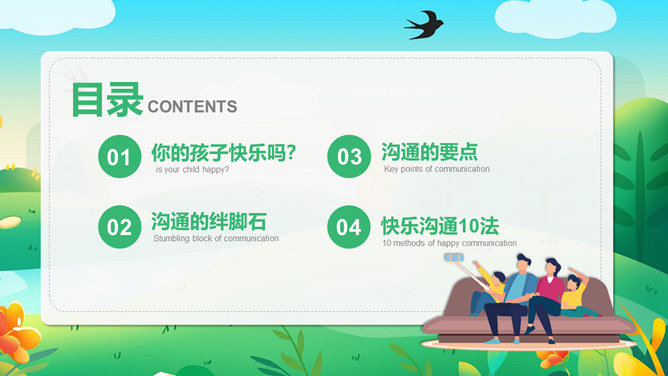 有用亲子交流技巧PPT模板。目录:你的孩子高兴吗?交流的关键。交流的拦路虎。高兴交流10法。