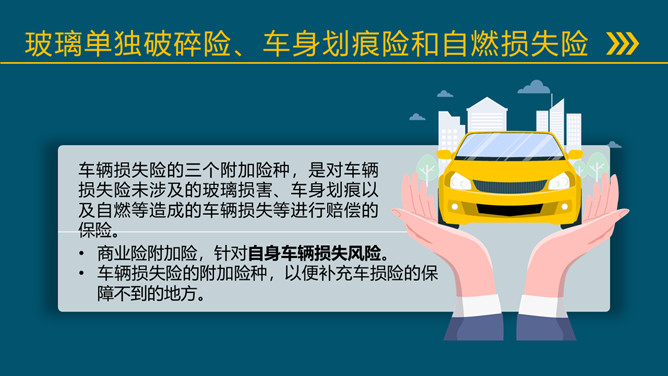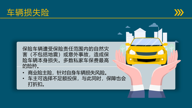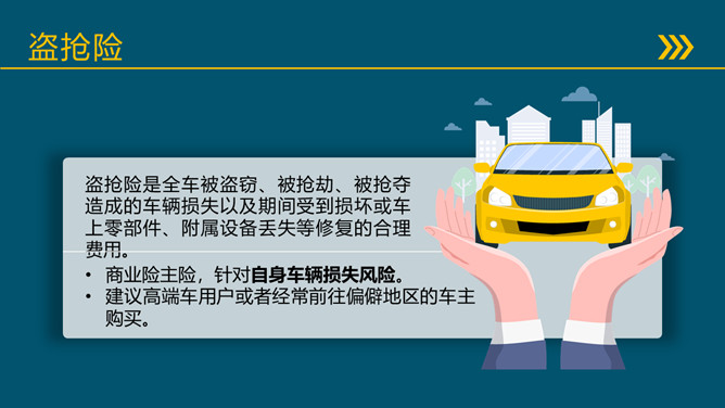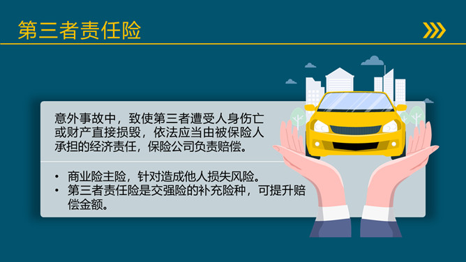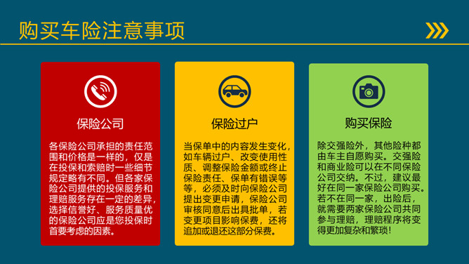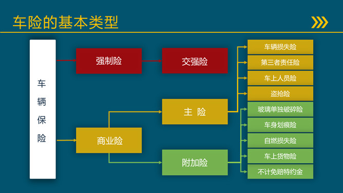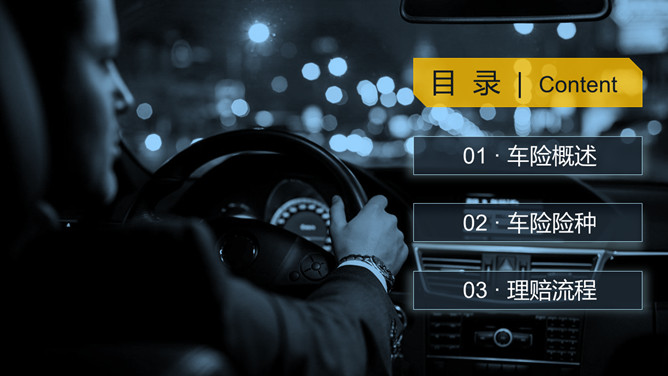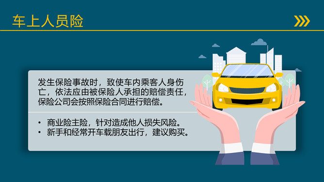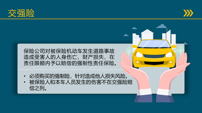 汽车保险基础知识训练PPT模板。一套汽车保险相关的基础知识训练幻灯片模板,包括车险概述、车险险种、理赔流程等内容。