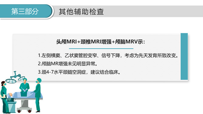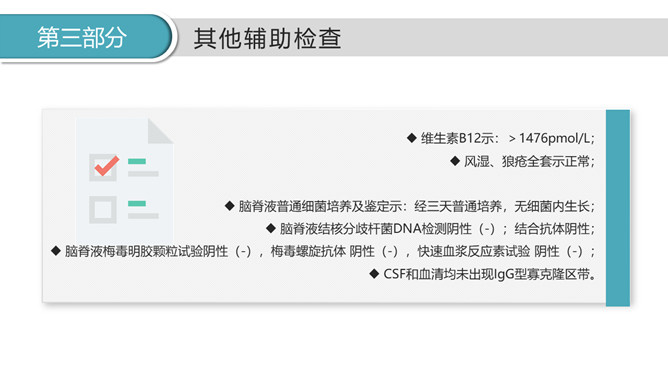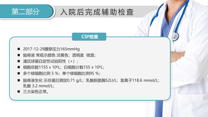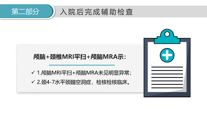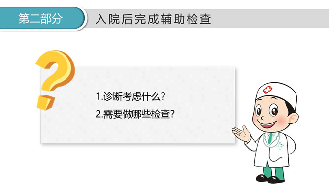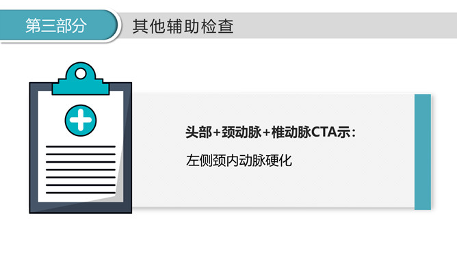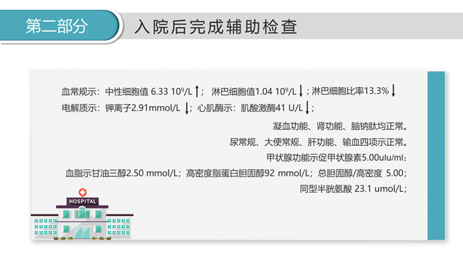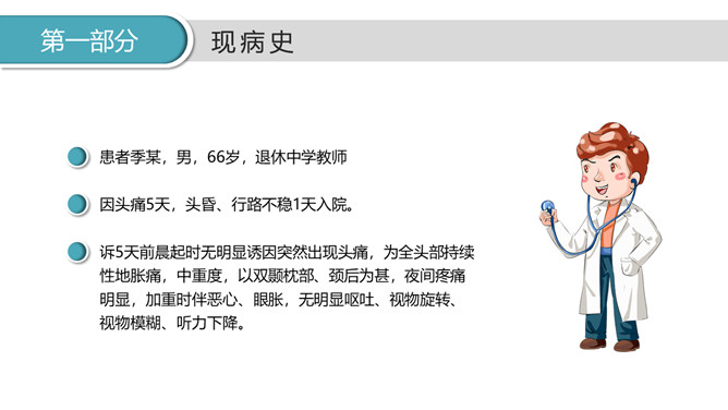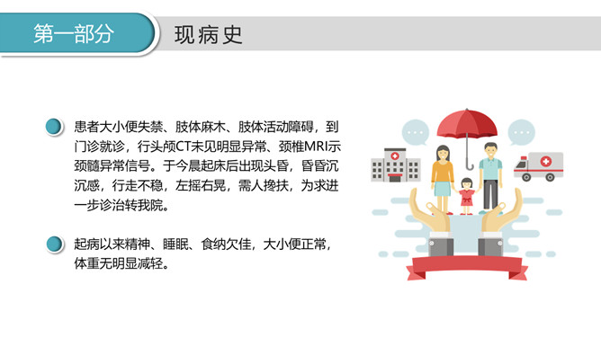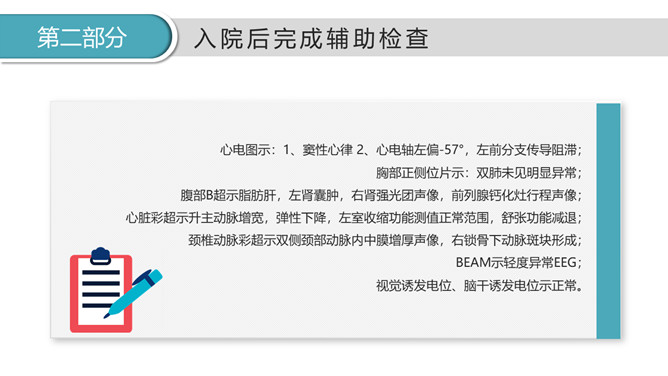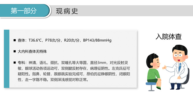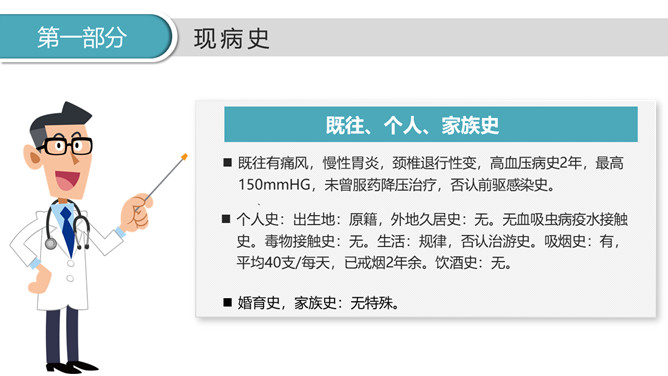 医师治疗病例剖析PPT模板。一套通用医疗幻灯片模板,包括现病史、入院后完结辅佐查看、其他辅佐查看等内容。
