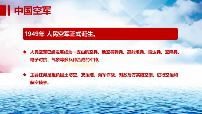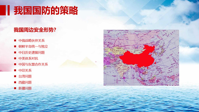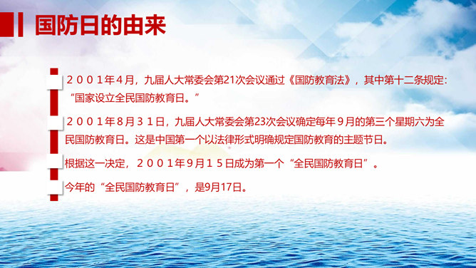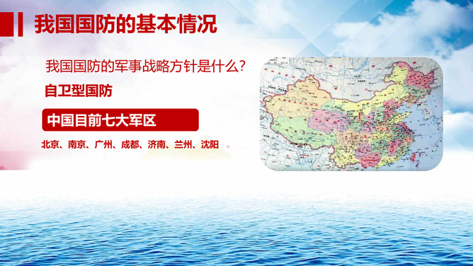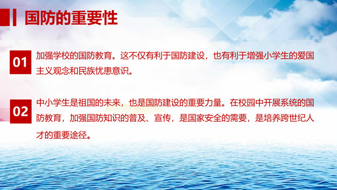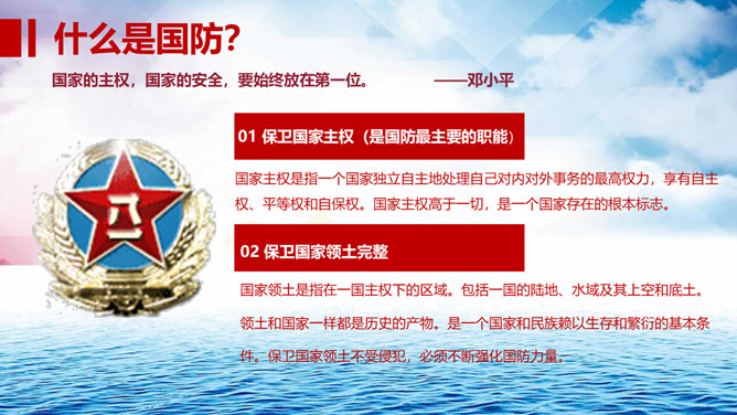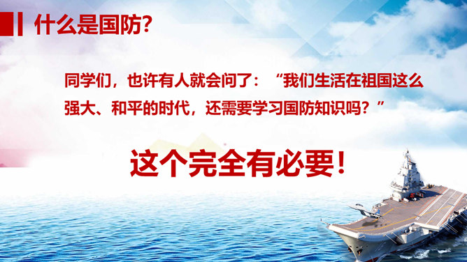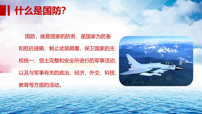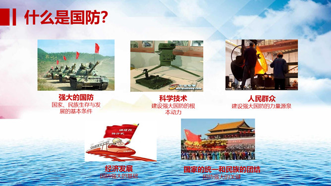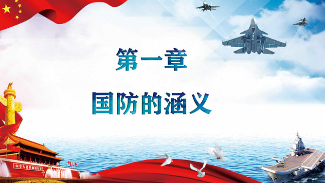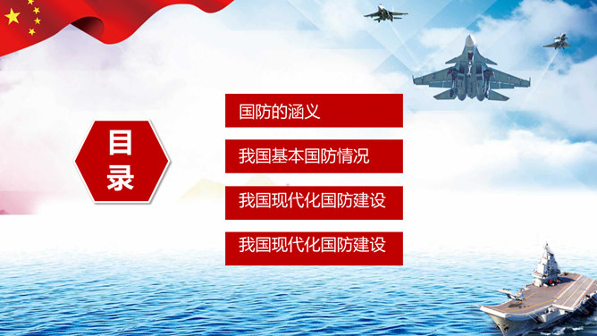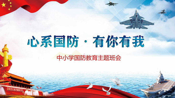 中小学国防教育主题班会PPT模板。包括国防的寓意、我国根本国防情况、我国现代化国防建设、我国国防事业的发展历程。
