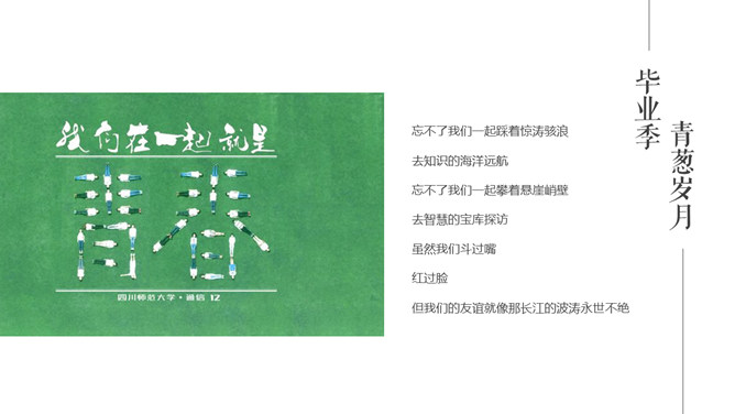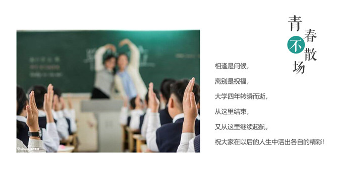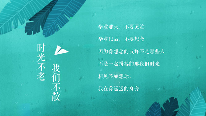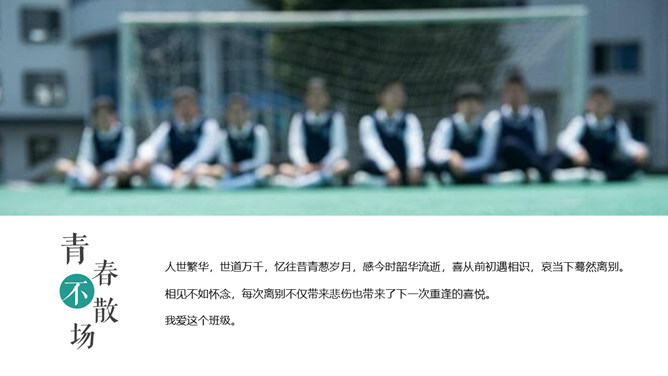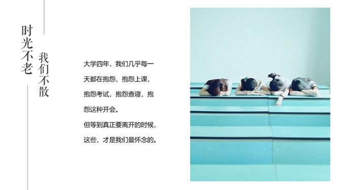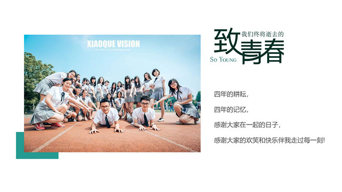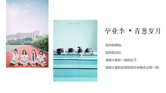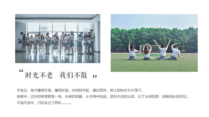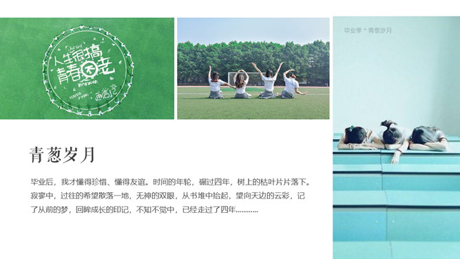 芳华留念结业相册PPT模板。一套唯美小新鲜相册幻灯片模板,适合大学生结业留念、芳华留念等相关用途。