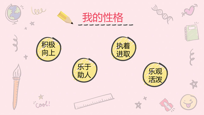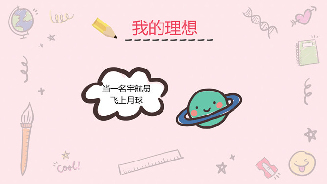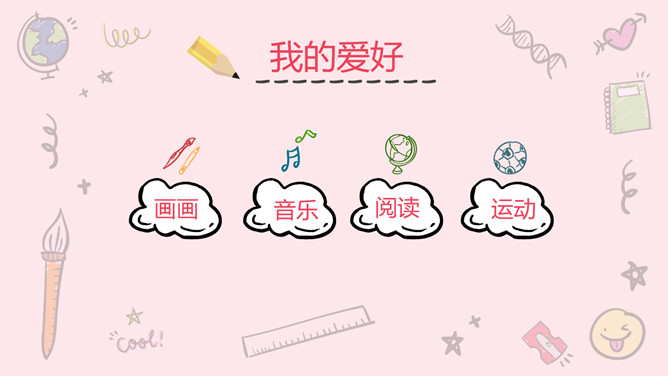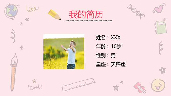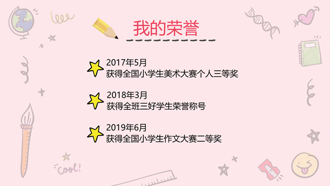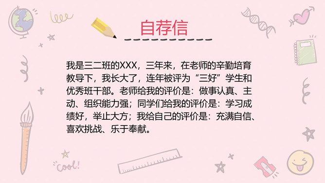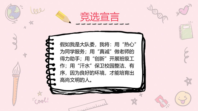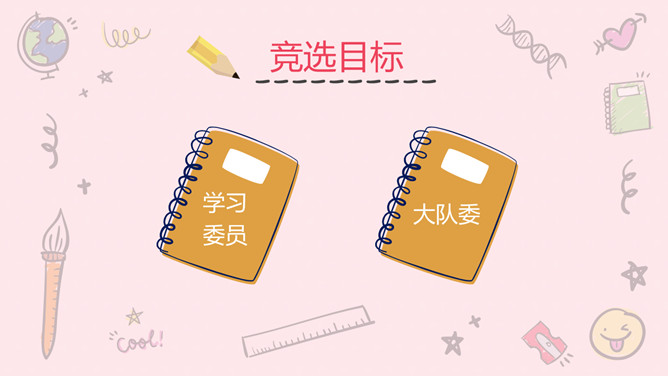 小学生班干部竞选PPT模板。一套心爱卡通风格自我介绍幻灯片模板,粉色主色调,适合小学生班干部竞选等用途。